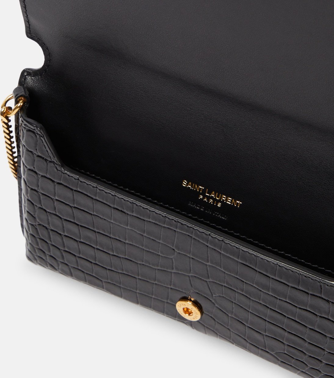 La célèbre collection d’accessoires de Saint Laurent accueille cette pochette pour téléphone à bandoulière chaîne amovible. Conçu en cuir embossé façon croco brillant, elle est ornée du monogramme Cassandre doré.