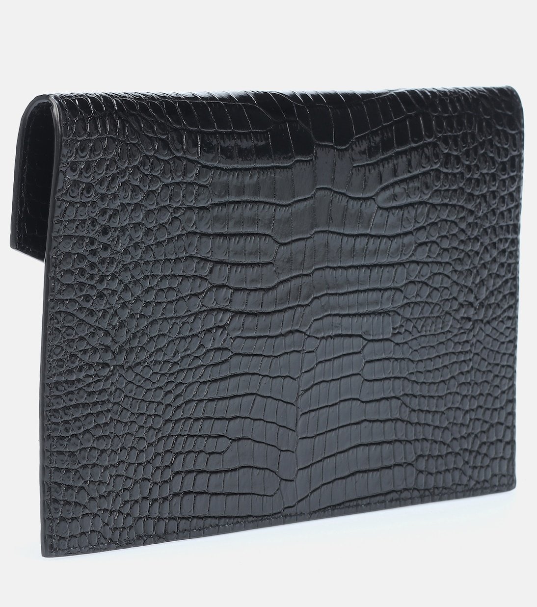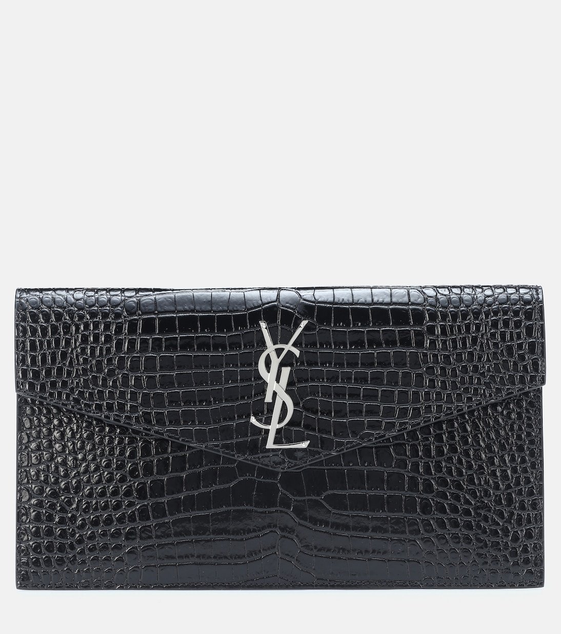 Luxueuse avec son cuir verni noir embossé façon croco, la pochette Uptown de Saint Laurent doit son allure résolument chic à sa plaque YSL en métal argenté. Épurée et intemporelle avec sa silhouette enveloppe, elle vous accompagnera de jour comme de nuit.