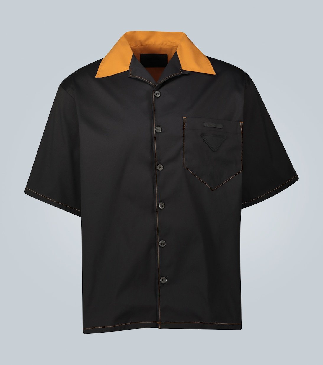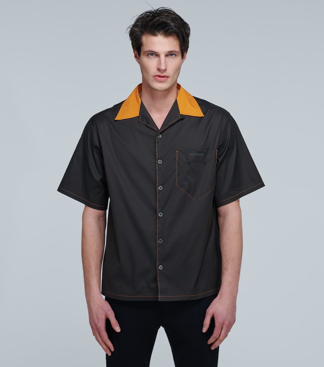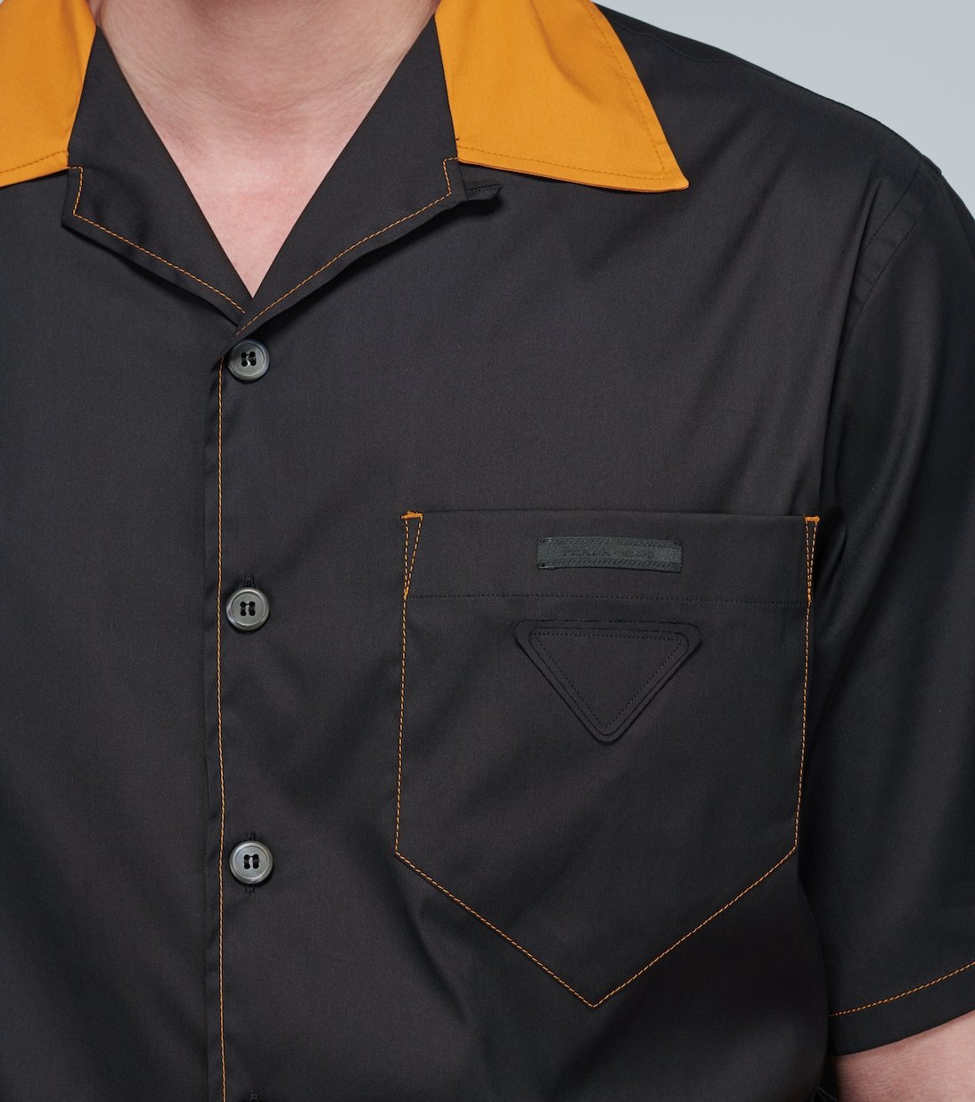 Doté d’une surpiqûre marron caractéristique, ce polo classique signé Prada est doté d’une fermeture boutonnée sur le devant et d’un col marron contrastant. Il arbore le logo de la marque, cousu sur la poche à l’avant.