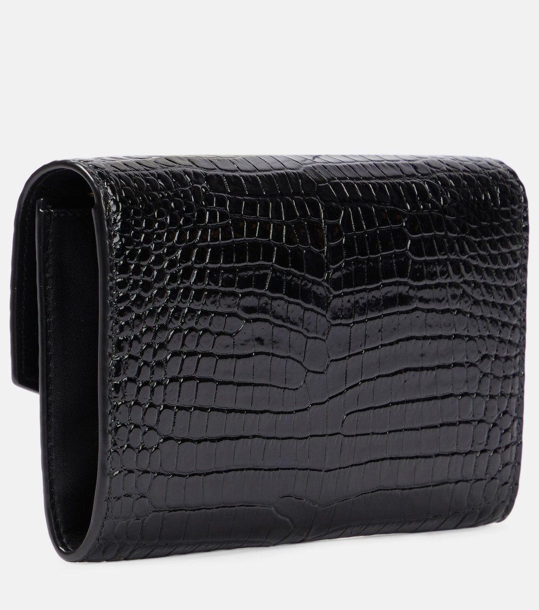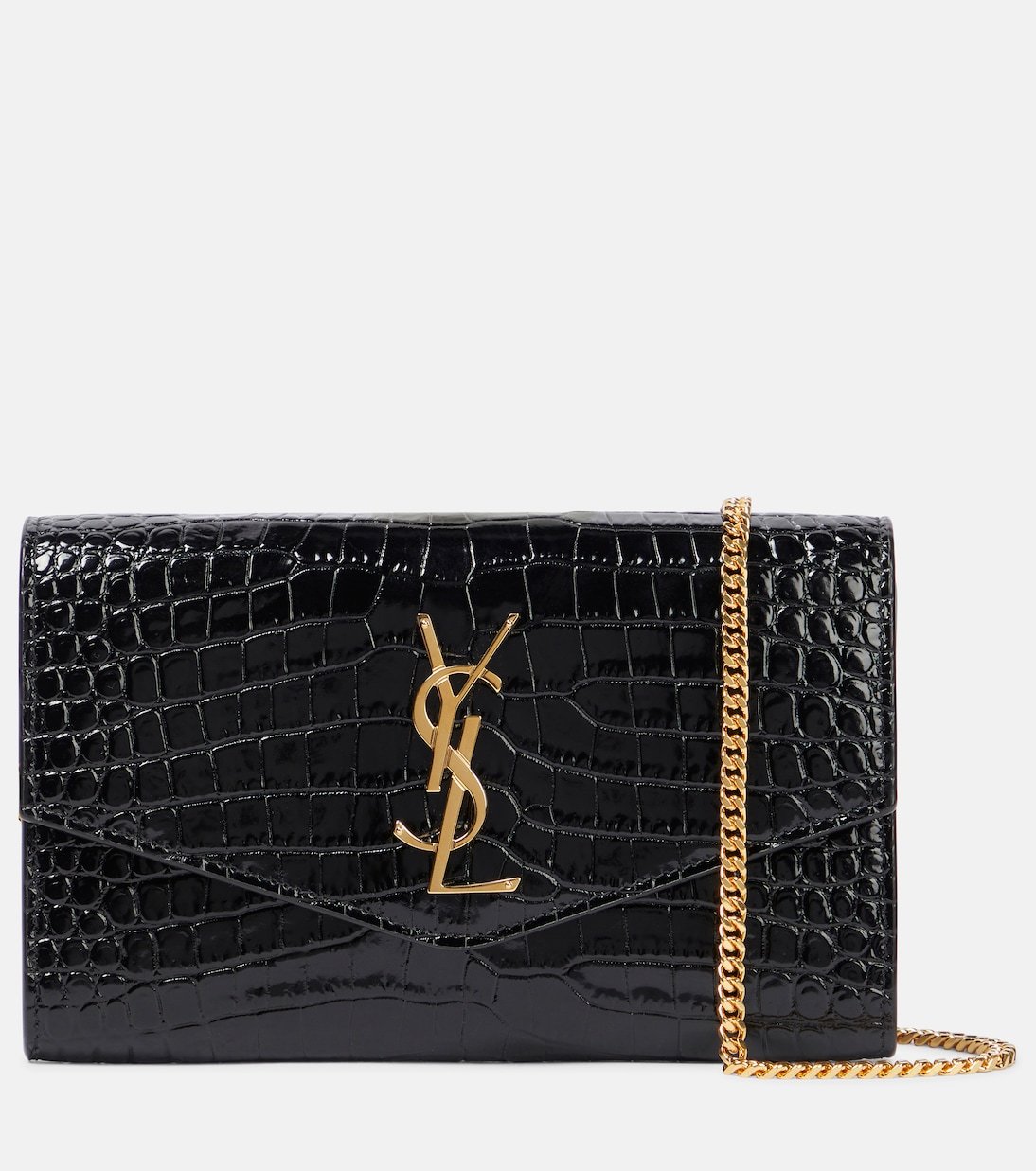 Les accessoires Saint Laurent s’illustrent par leur sophistication naturelle. Le portefeuille Uptown est confectionné en Italie en cuir noir embossé d’un effet crocodile, tandis qu’il est orné du monogramme YSL doré et arbore une bandoulière chaîne.