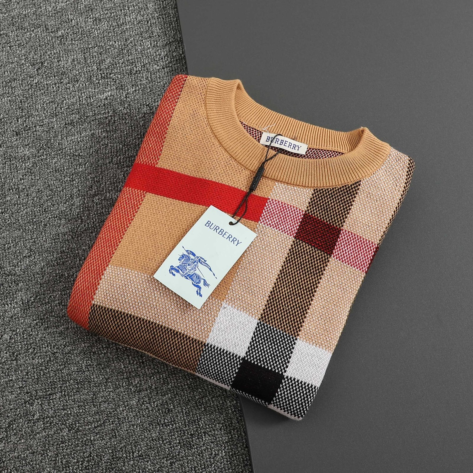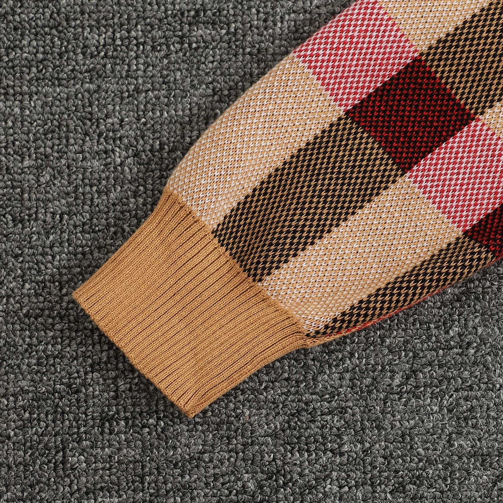 Pull Burberry à manches longues, arborant l’incontournable motif check dans des tons beiges, noirs, rouges et blancs. Un basique élégant et confortable signé Burberry.