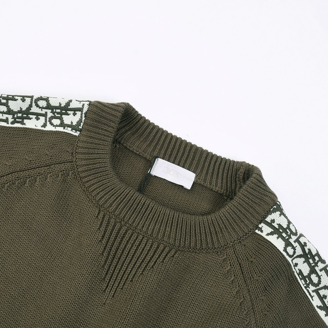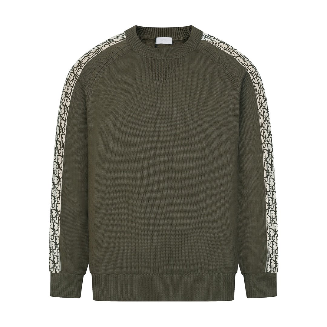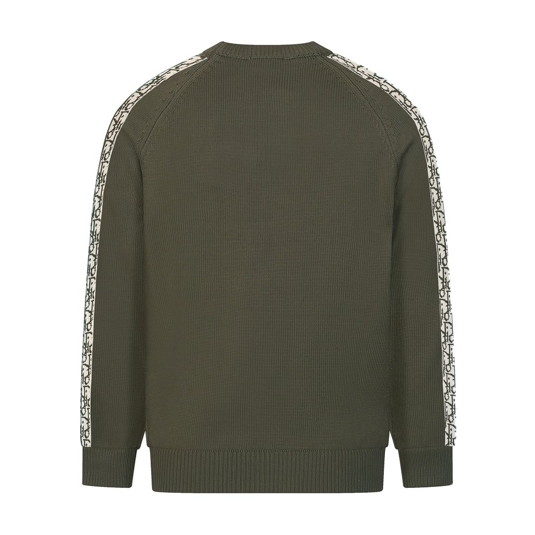 Pull Dior en maille douce avec bandes logo Dior sur les manches, disponible en noir ou kaki.