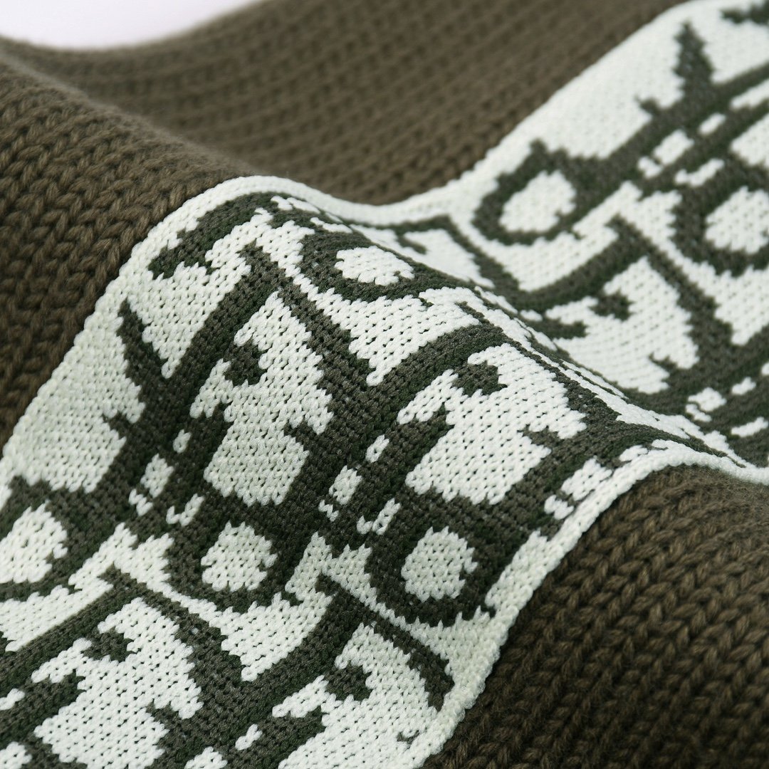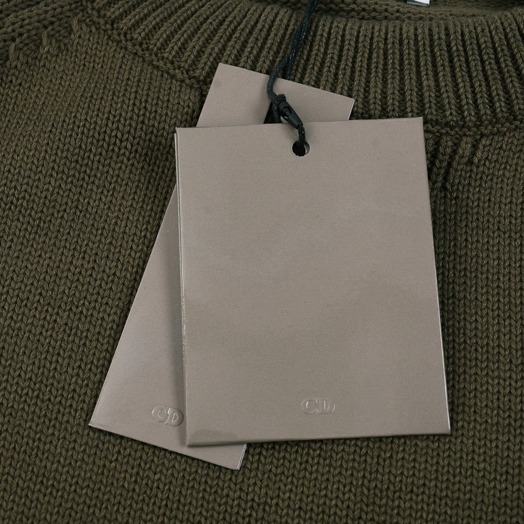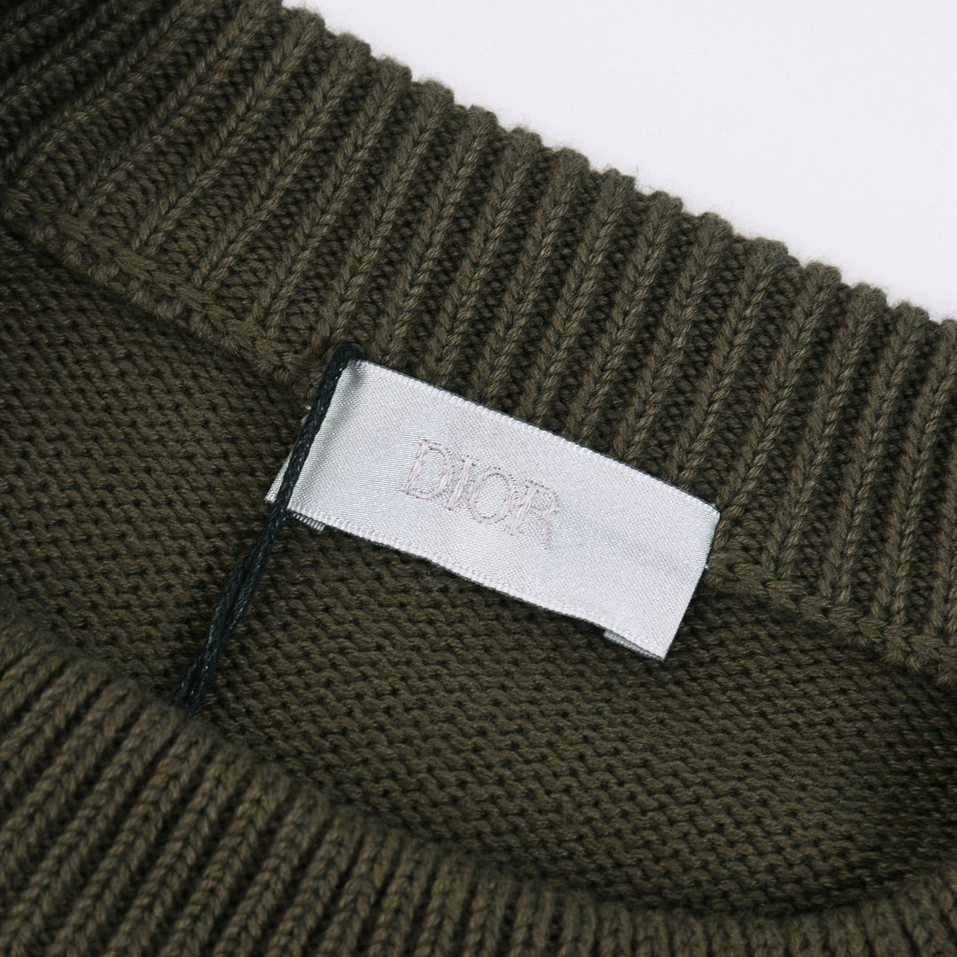 Pull Dior en maille douce avec bandes logo Dior sur les manches, disponible en noir ou kaki.