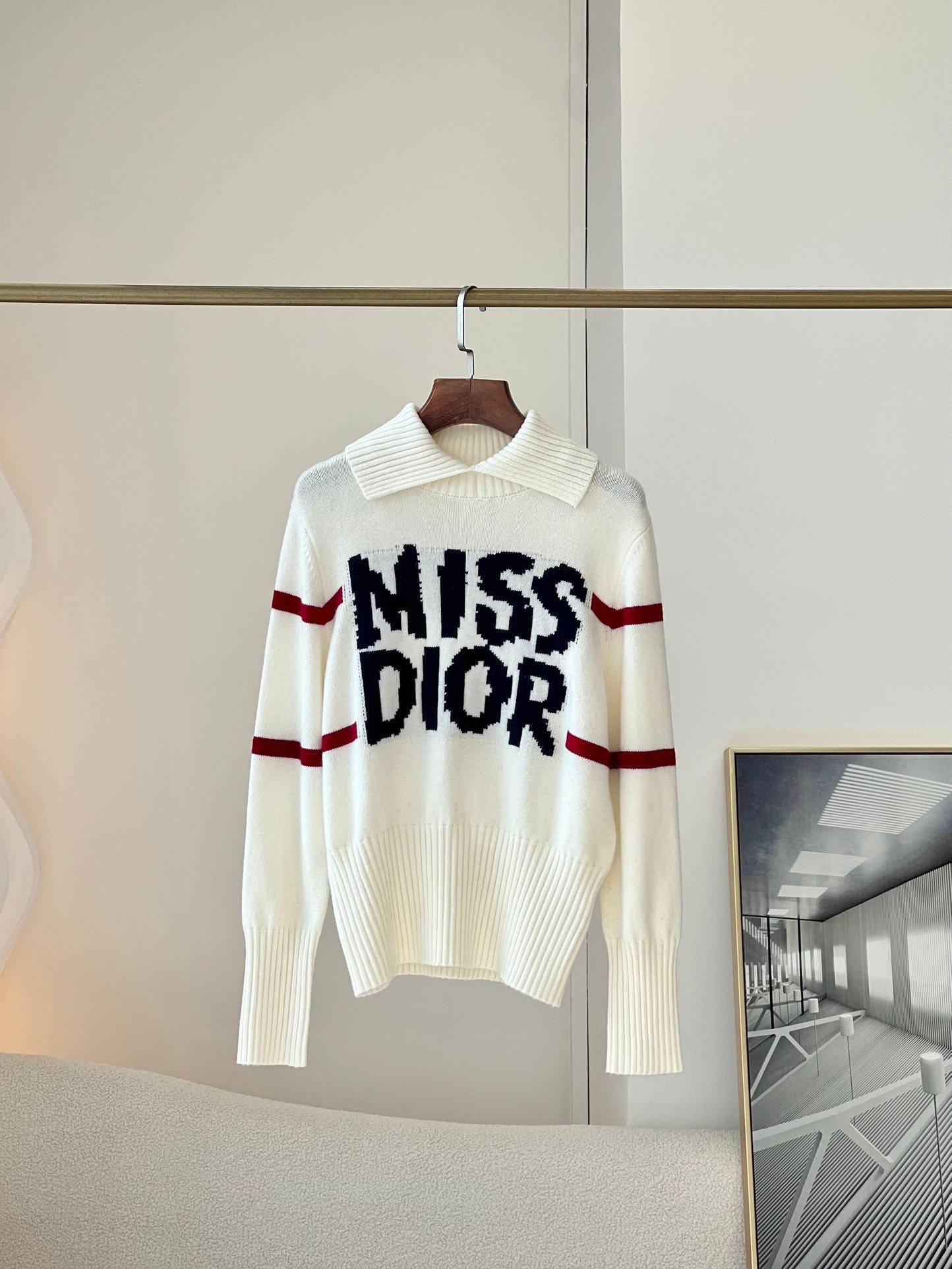 Ce pull Dior arbore le célèbre logo “Miss Dior” en jacquard contrasté, pour un style à la fois élégant et décontracté. Confectionné en laine douce et chaude, il se distingue par son col polo côtelé, ses bandes rouges sur les manches et son design graphique emblématique.