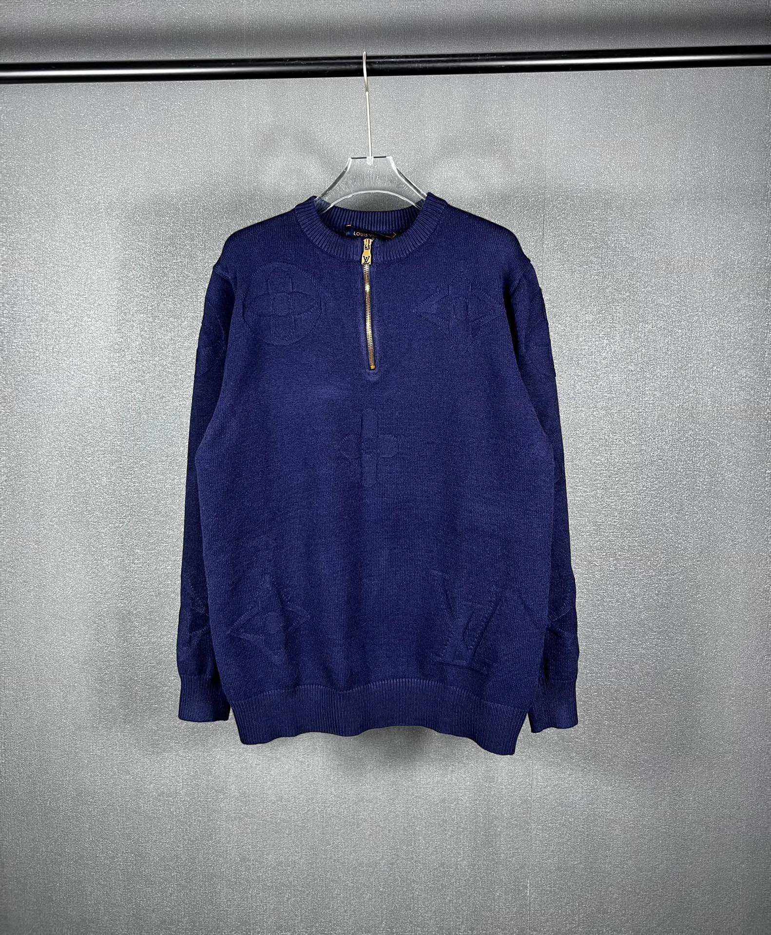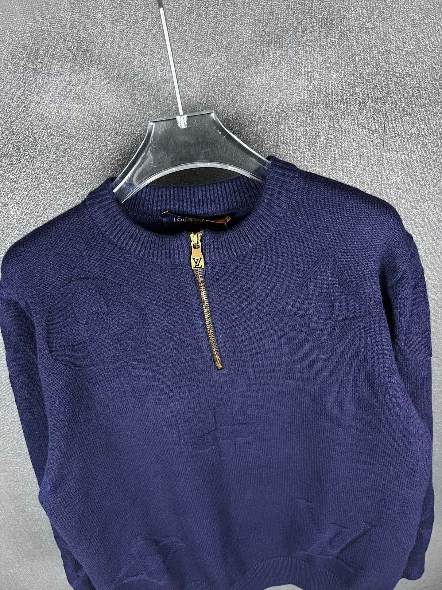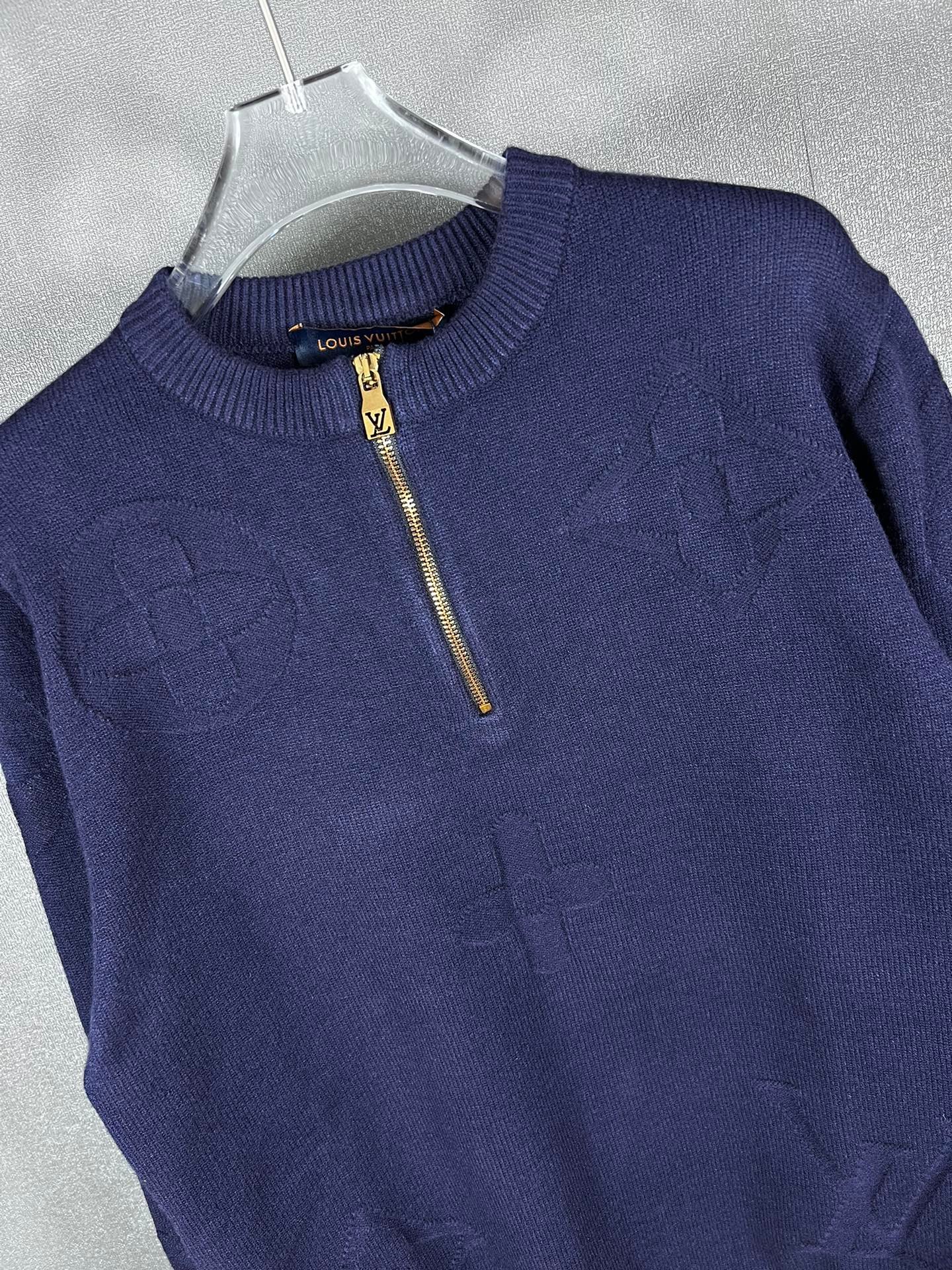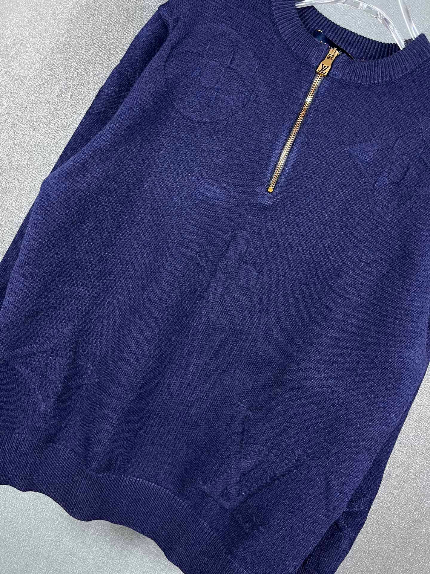 Pull Louis Vuitton en laine, demi-zip doré siglé LV, motifs monogrammes ton sur ton. Élégant et confortable, disponible en bleu ou gris.