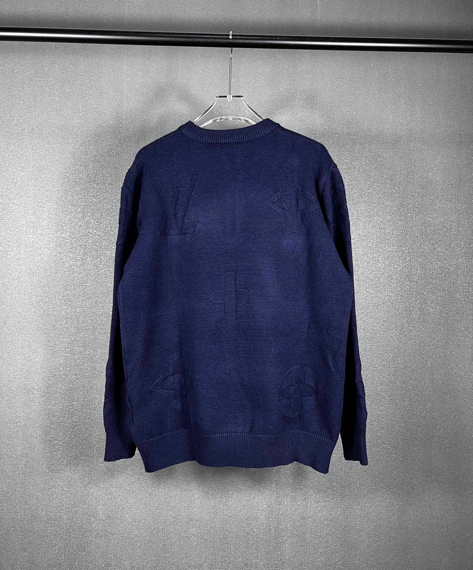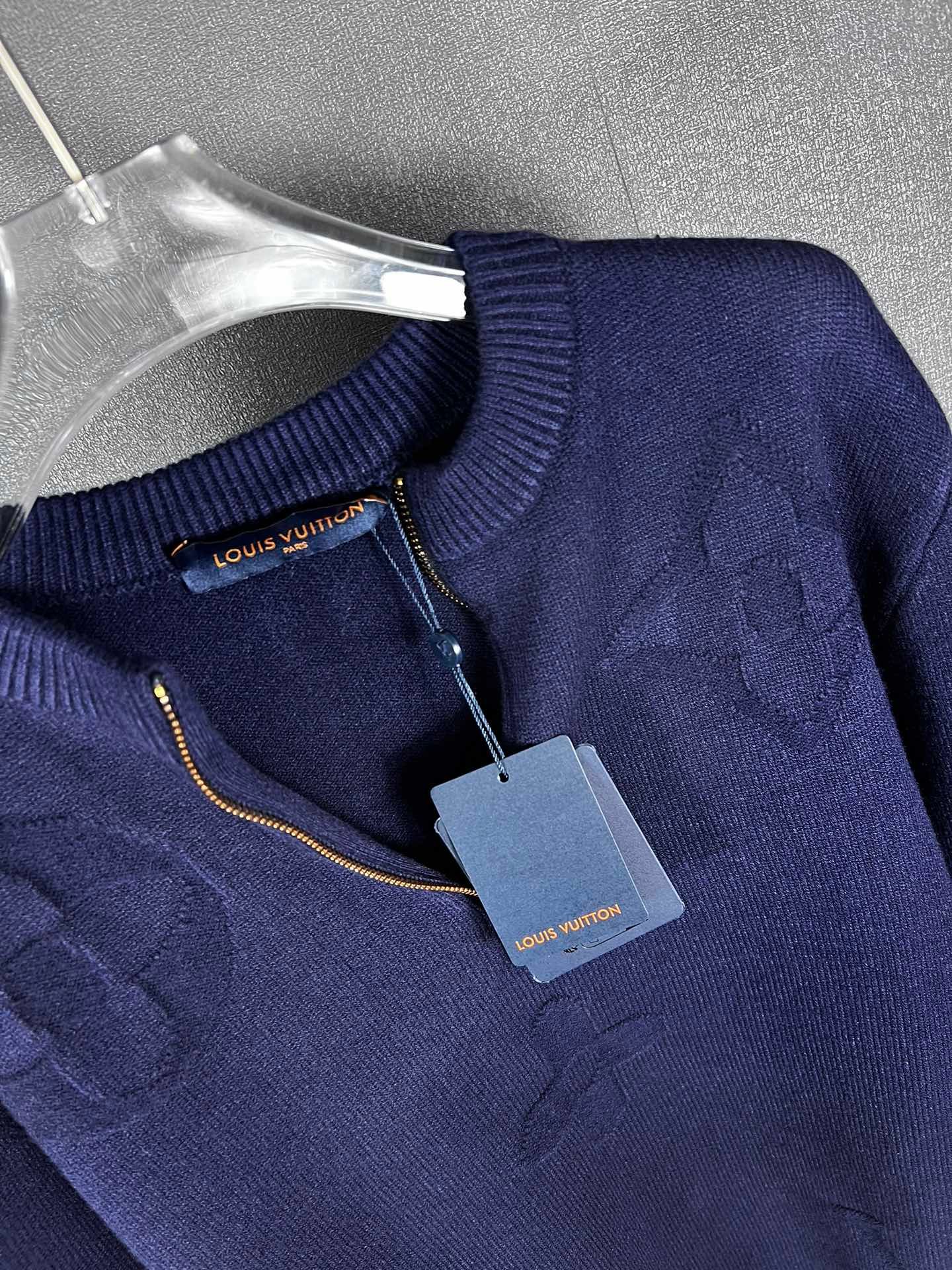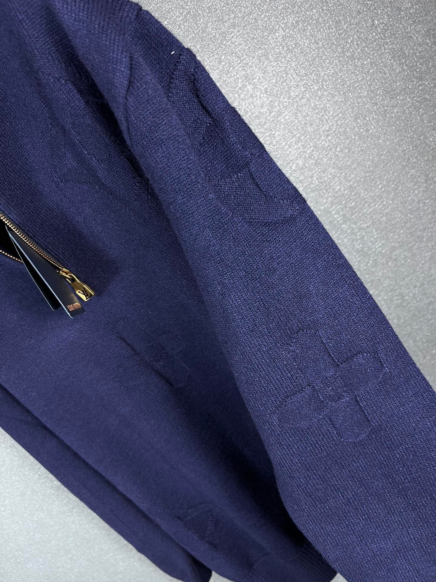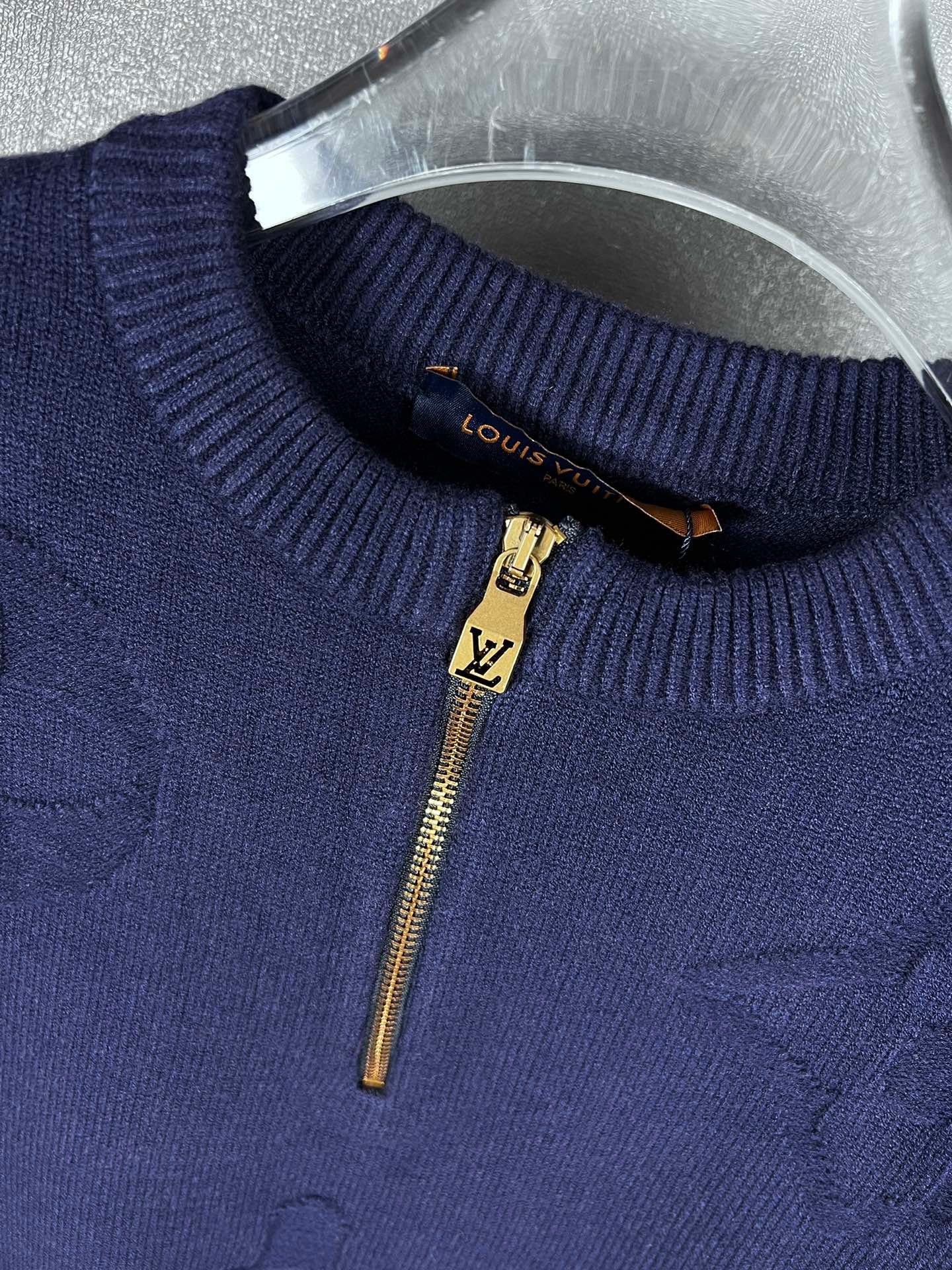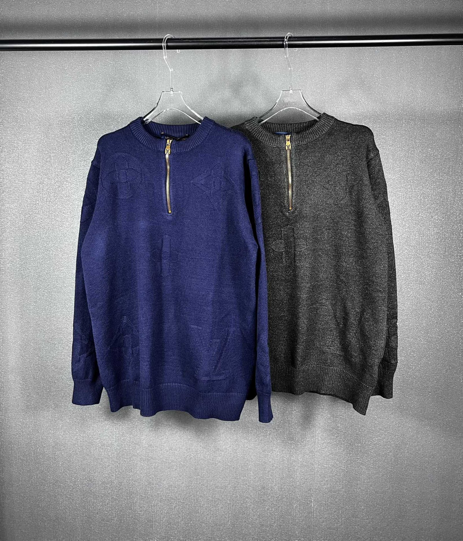Pull Louis Vuitton en laine, demi-zip doré siglé LV, motifs monogrammes ton sur ton. Élégant et confortable, disponible en bleu ou gris.