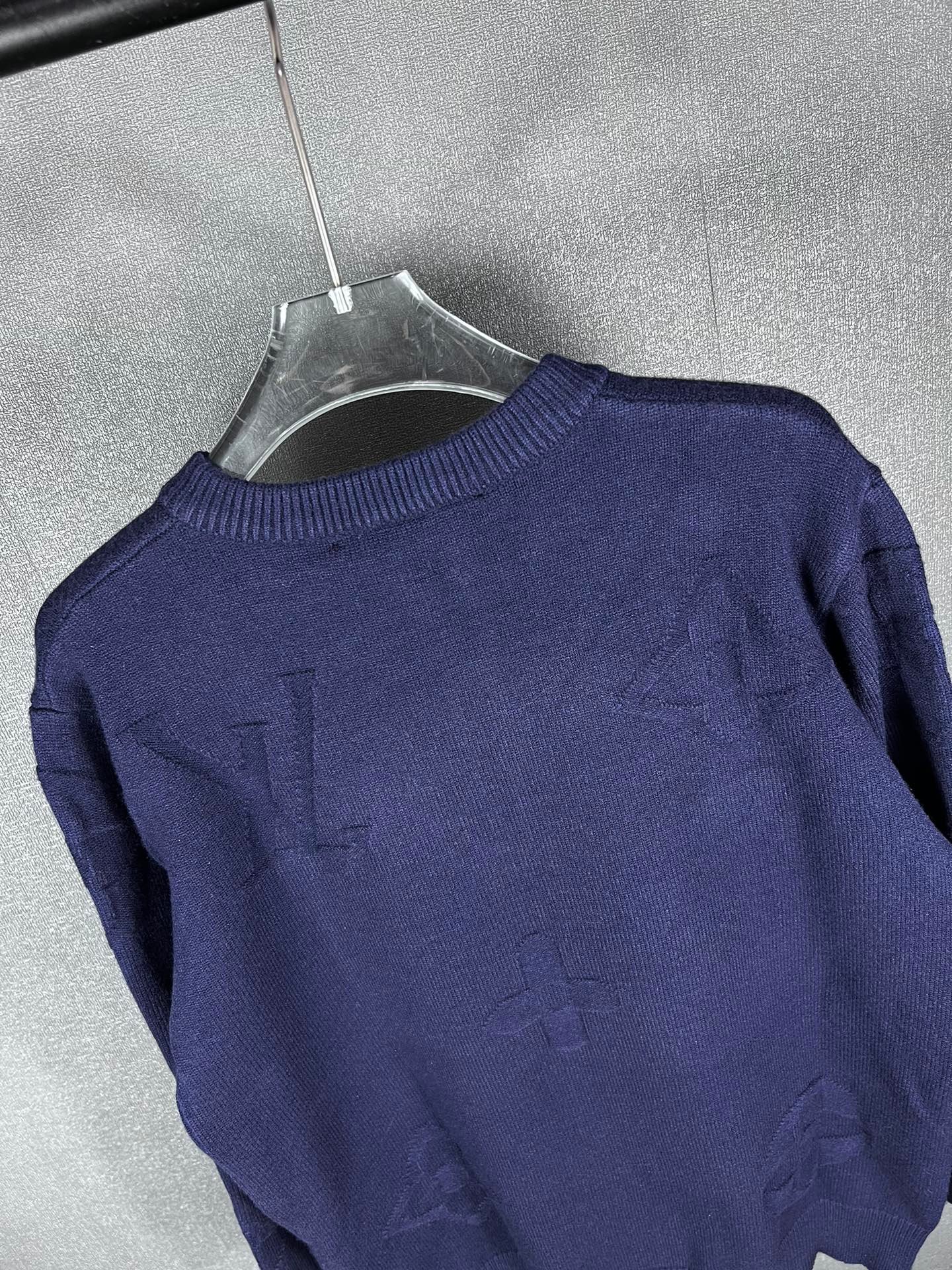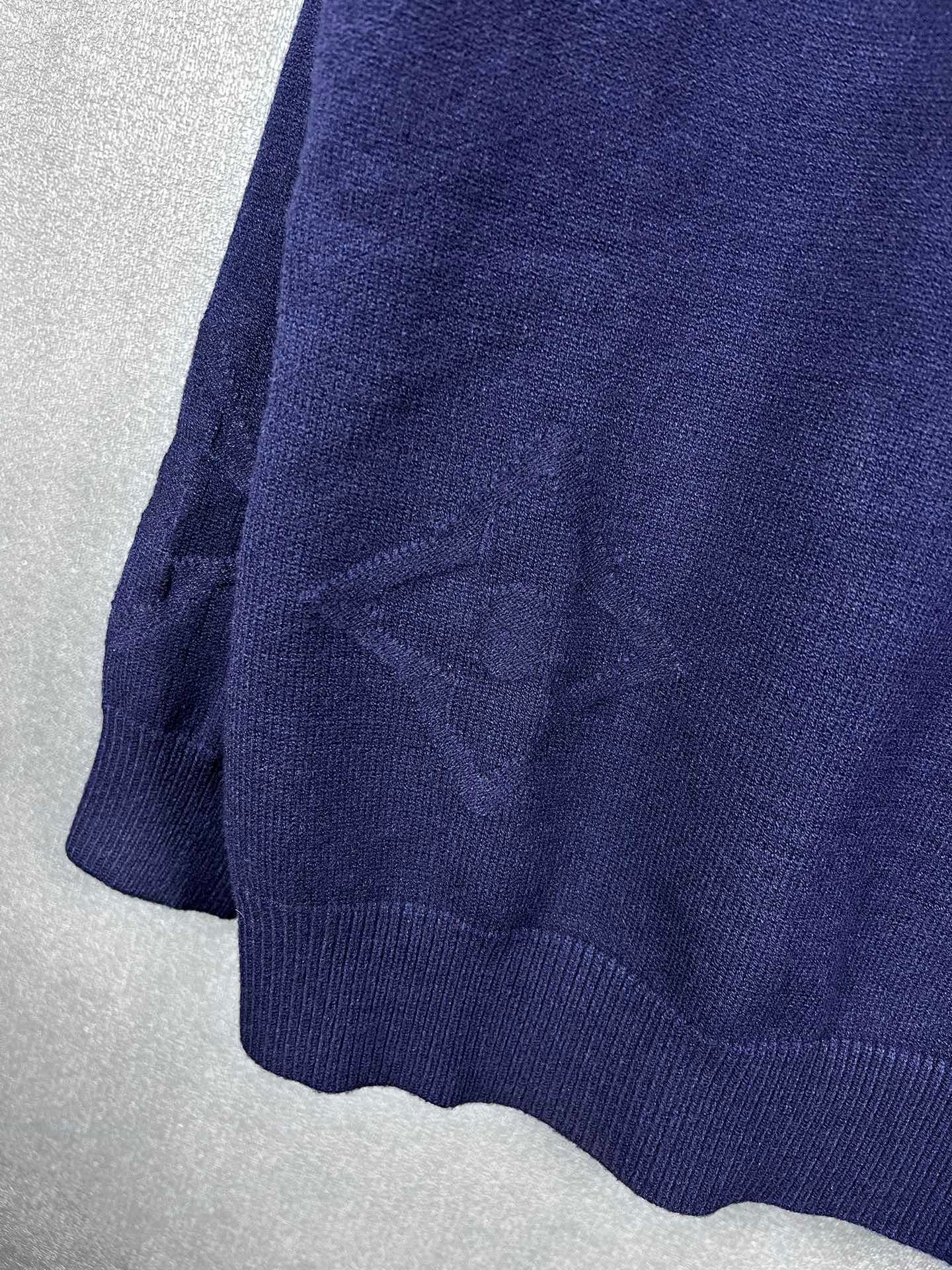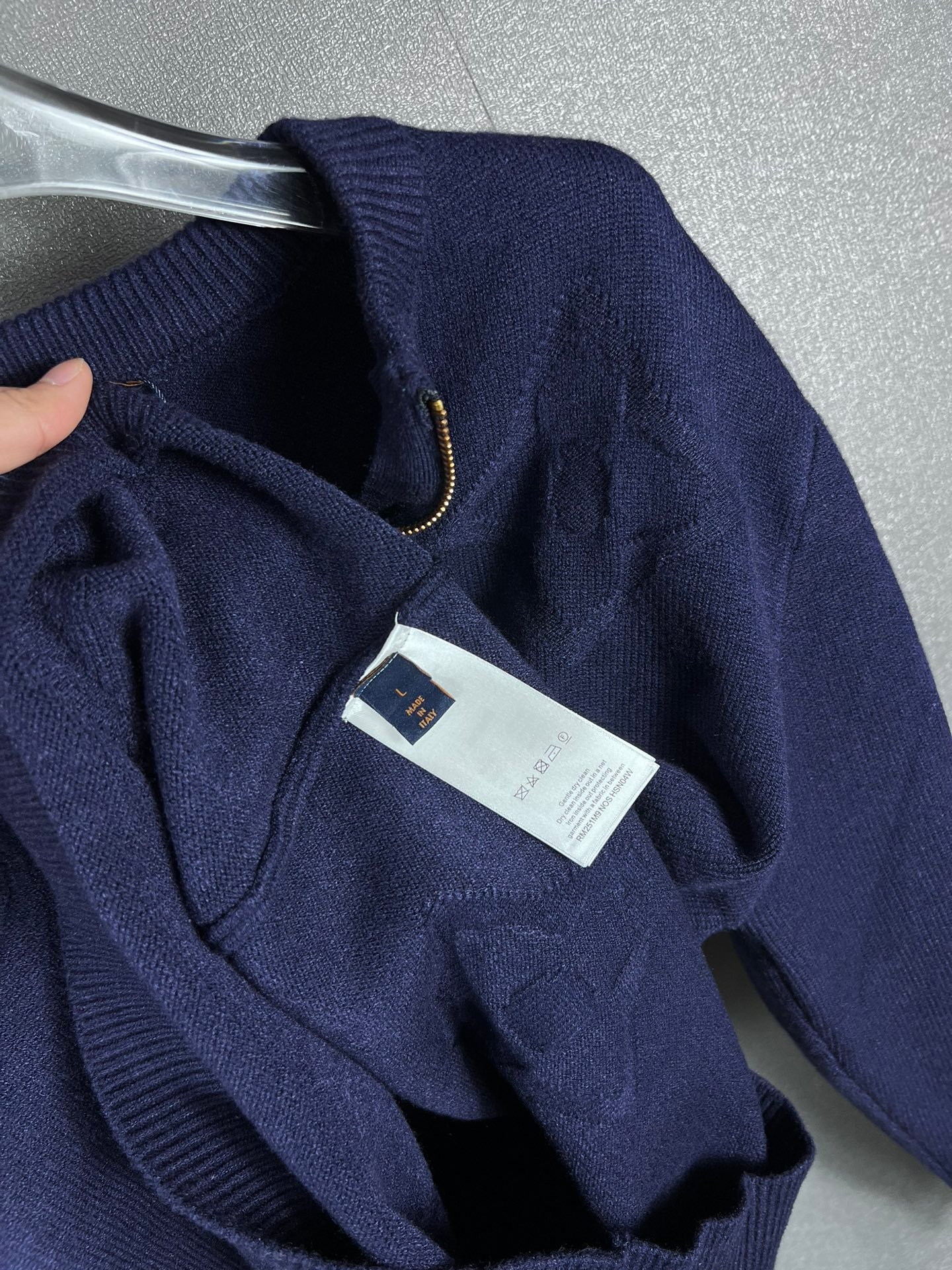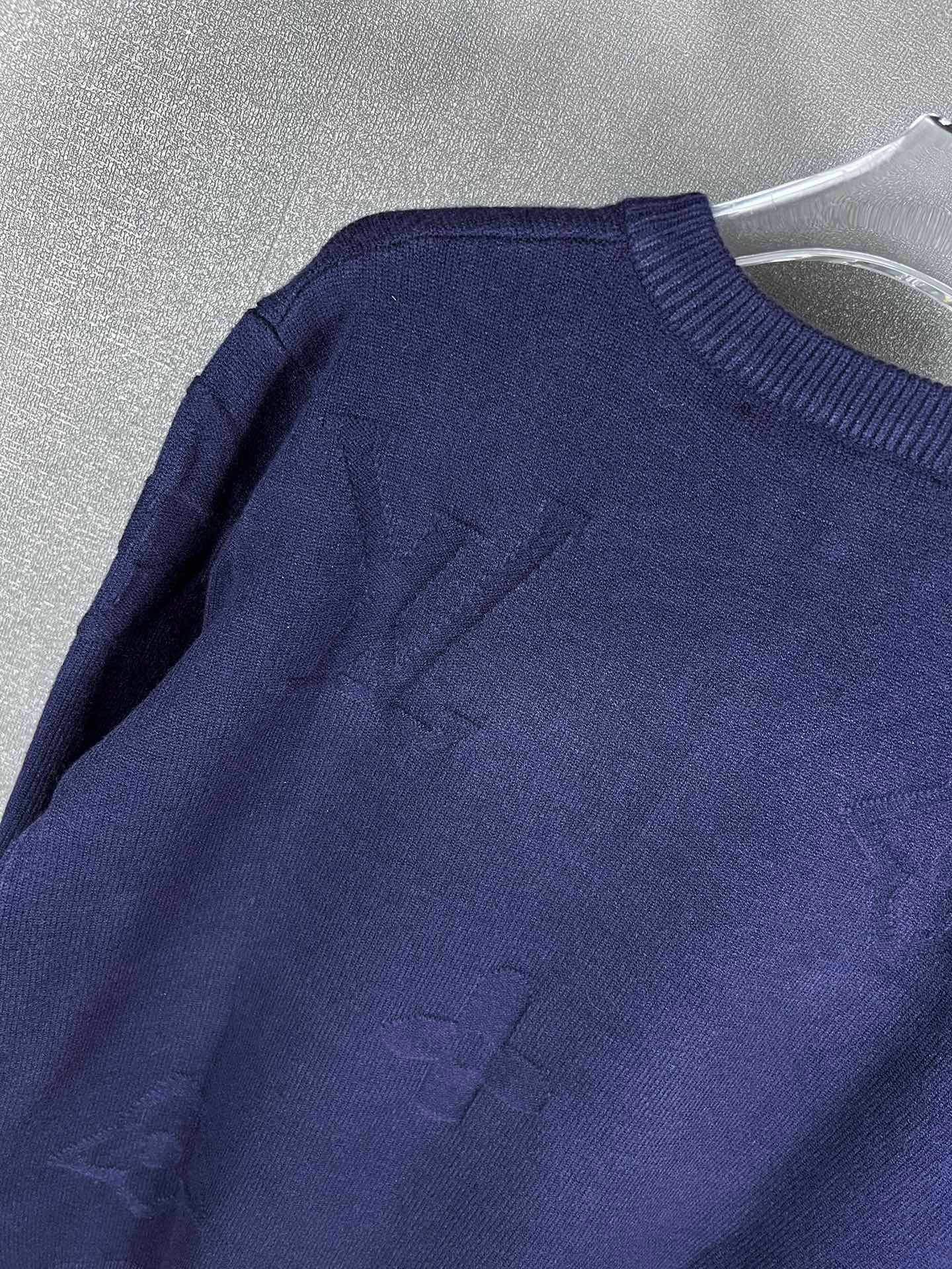 Pull Louis Vuitton en laine, demi-zip doré siglé LV, motifs monogrammes ton sur ton. Élégant et confortable, disponible en bleu ou gris.