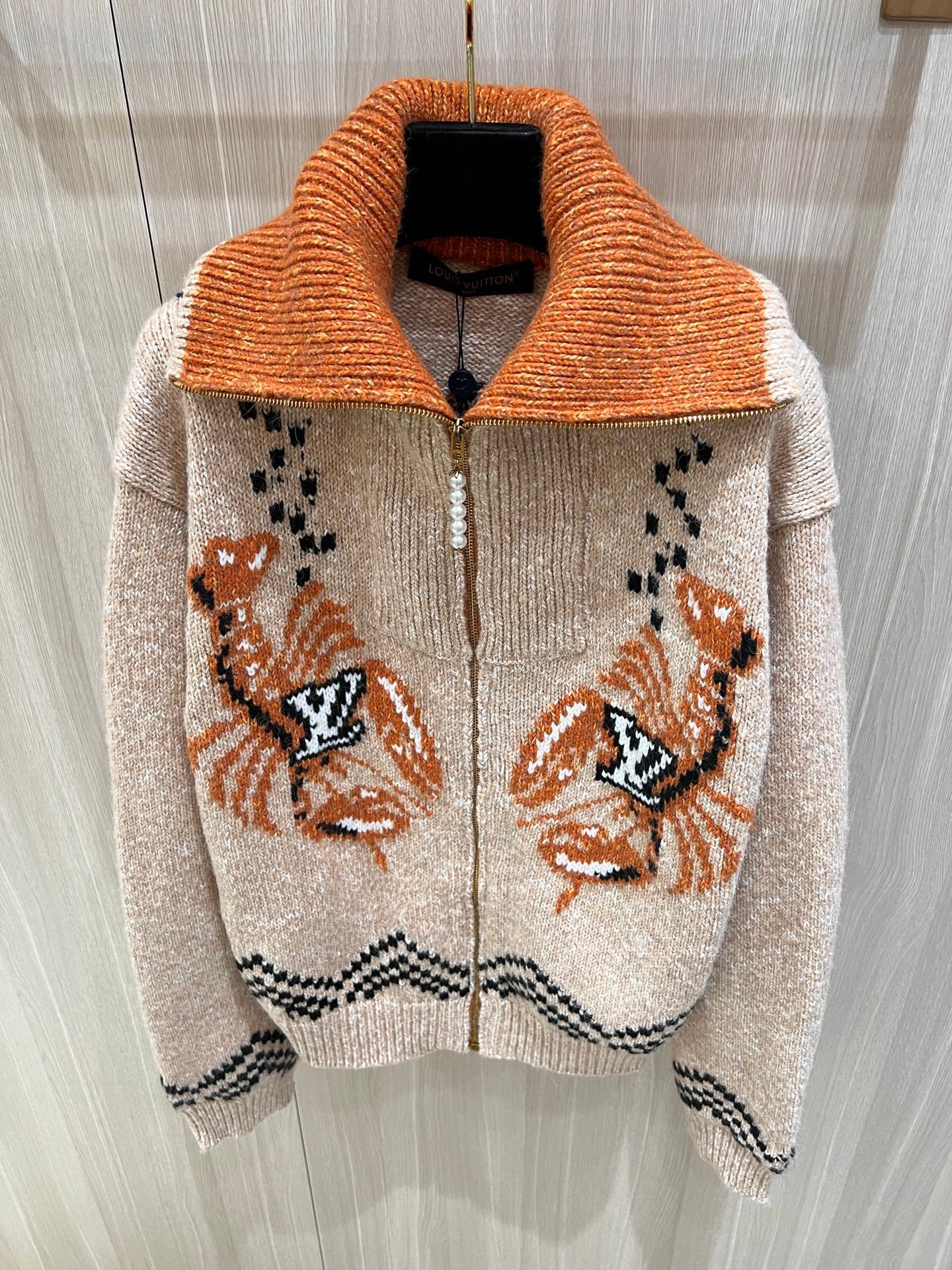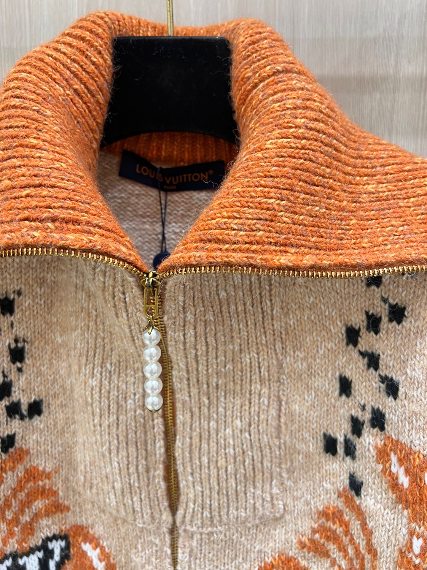 Réalisé en maille épaisse italienne, il présente un col montant contrastant orange, une fermeture zippée dorée ornée d’un élégant pendentif à perles, et des motifs graphiques tissés sur le devant et le dos, dont le logo LV emblématique.
