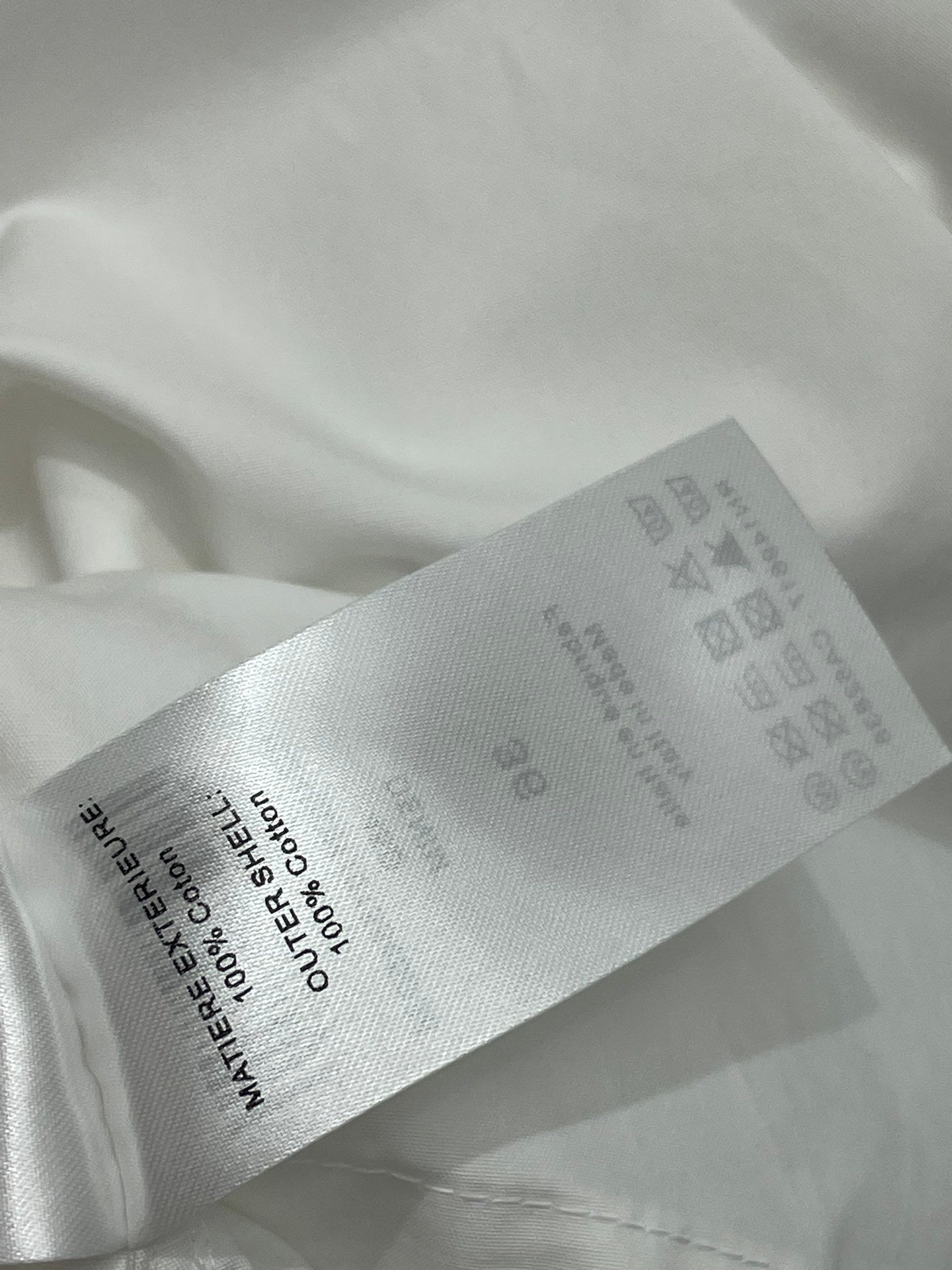 Réalisée dans un coton blanc éclatant, elle se distingue par sa coupe droite fluide, ses manches bouffantes trois-quarts et sa ceinture assortie qui souligne délicatement la taille.