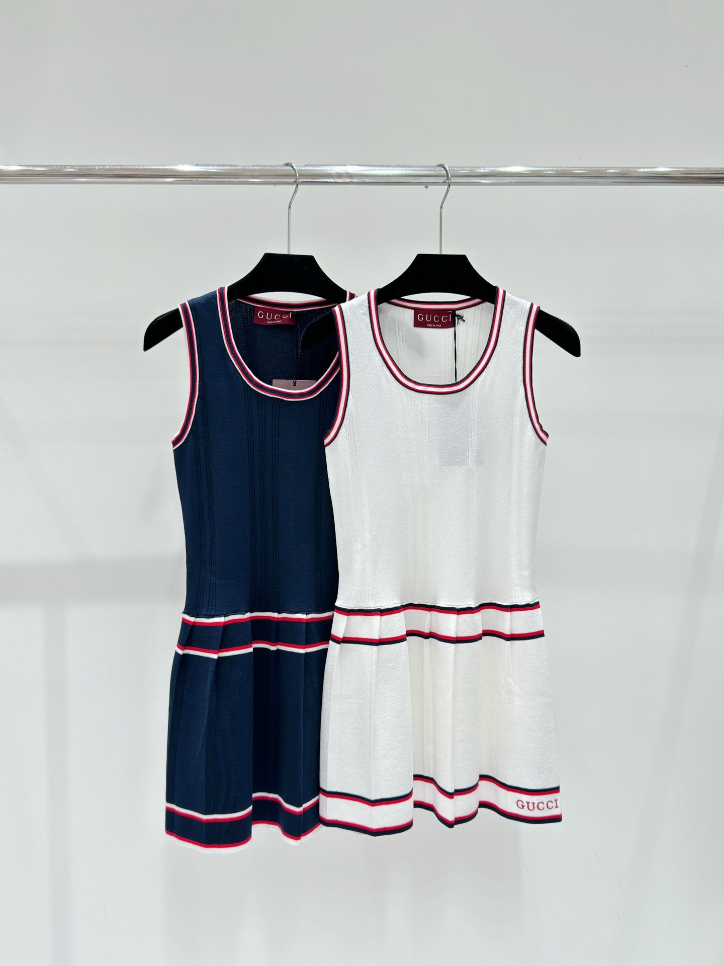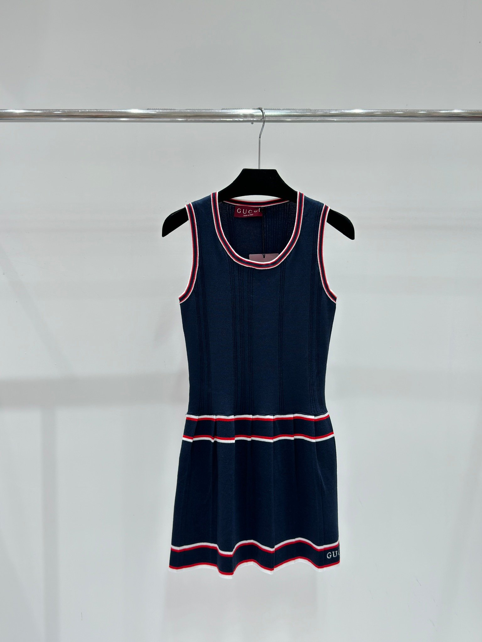 Cette robe sans manches Gucci en maille texturée incarne l’élégance sportive et raffinée de la maison italienne.