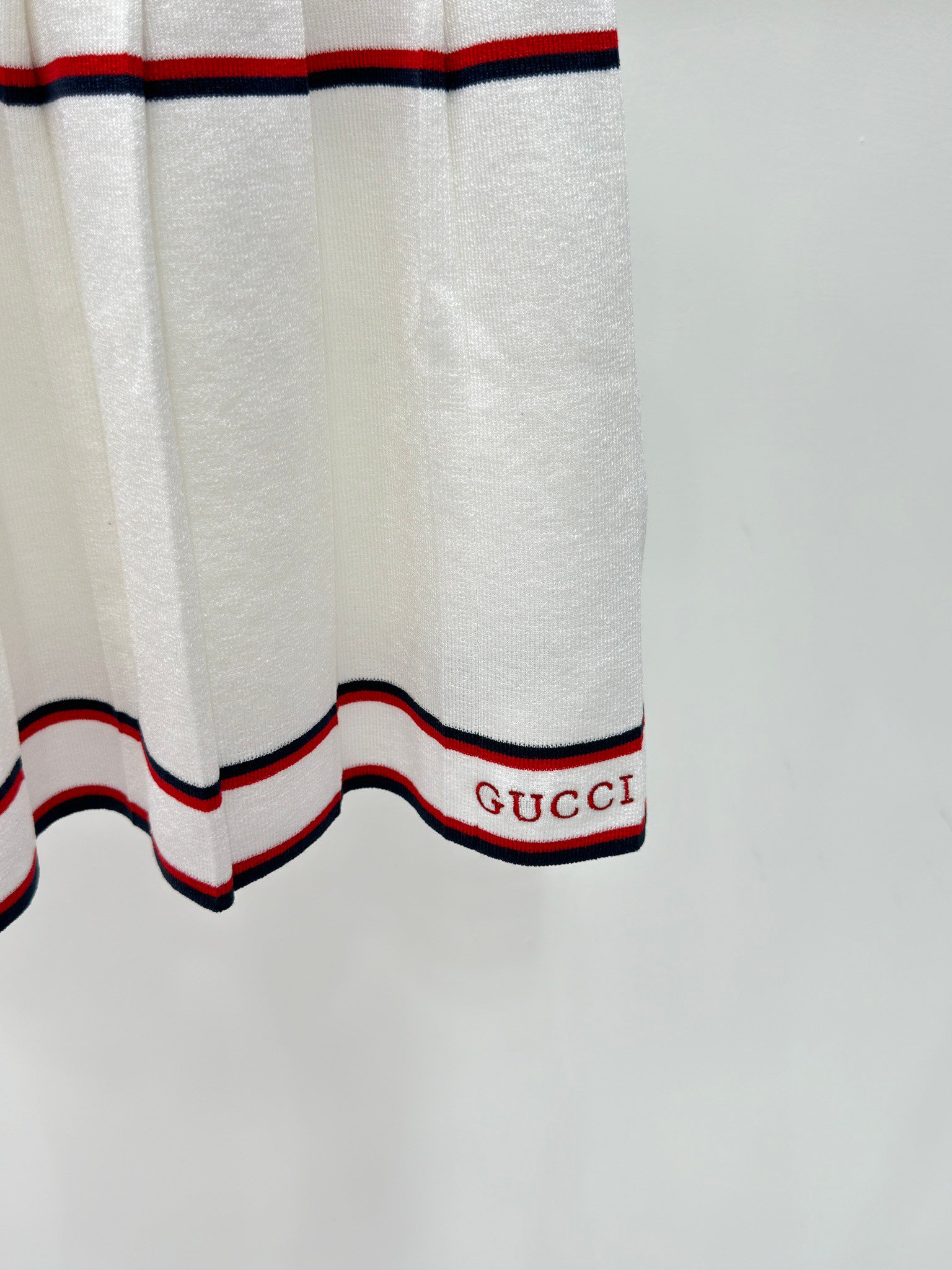 Le logo Gucci brodé sur le bas de la robe affirme son authenticité et son raffinement.