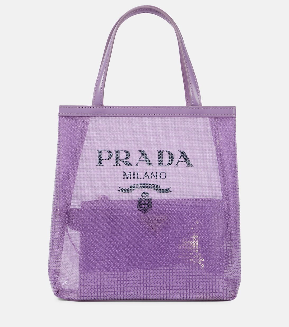Prada relève un essentiel minimaliste de sa touche luxueuse avec ce petit cabas en résille. Ce modèle semi-transparent recouvert de sequins violets est imprimé du logo de la maison et possède une pochette intérieure zippée.