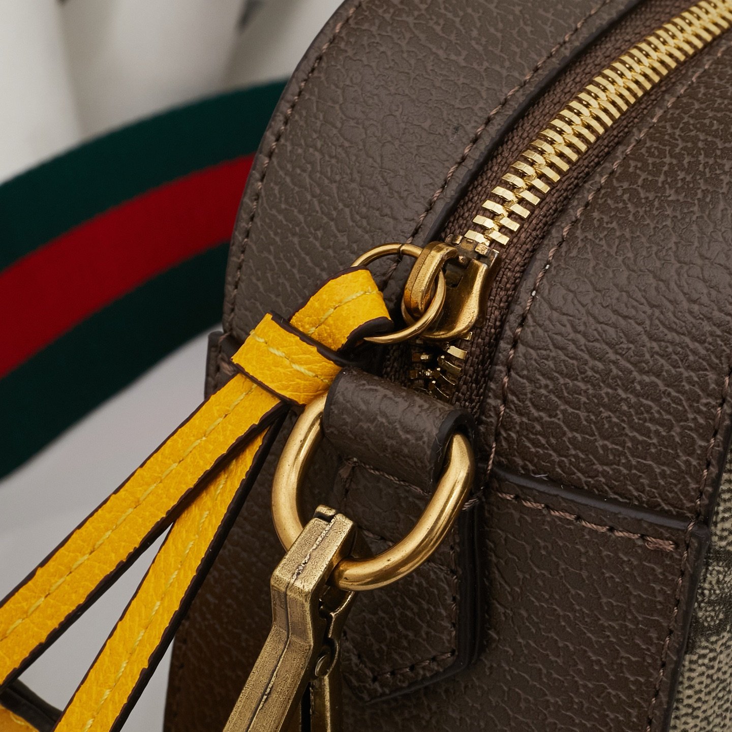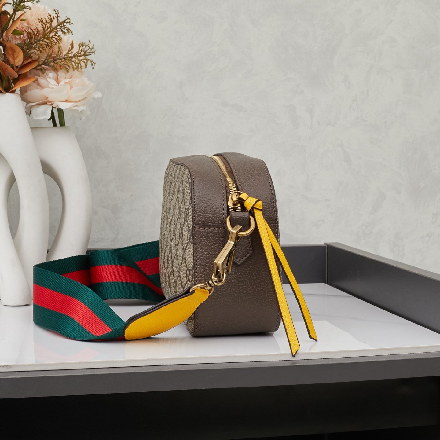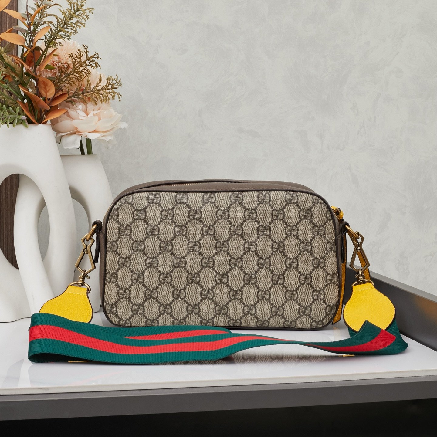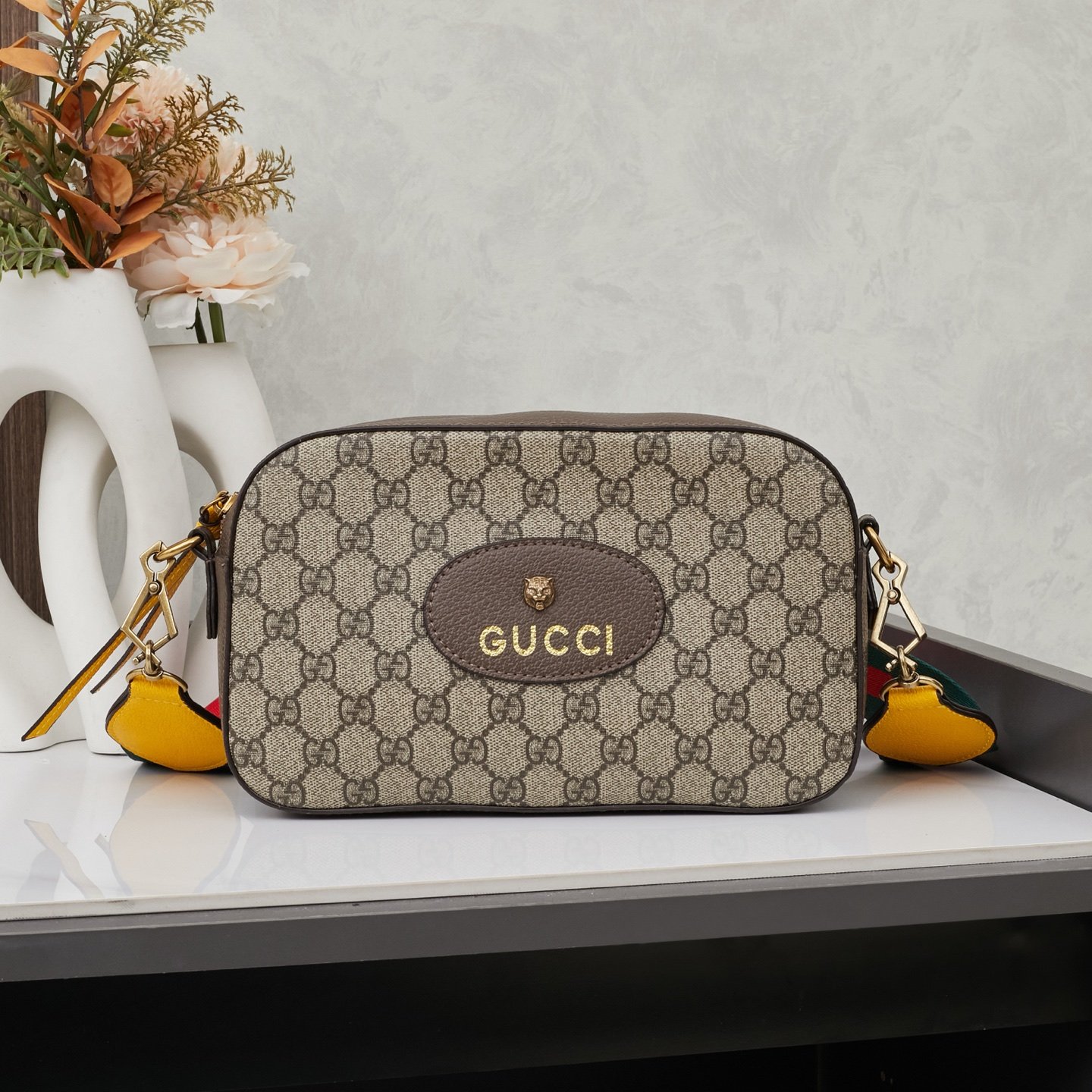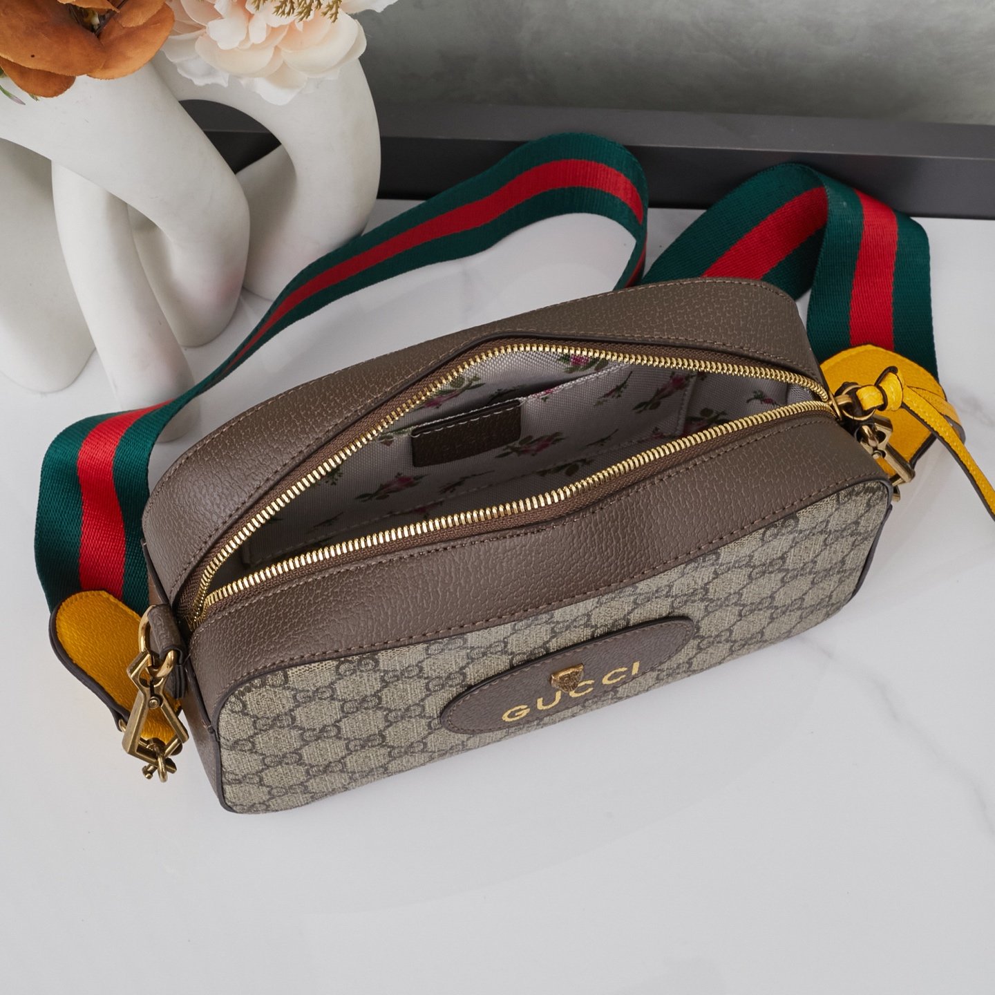 Confectionné en toile GG Supreme beige et ébène, il arbore le logo emblématique GUCCI doré sur un médaillon en cuir marron orné d’une tête de félin. Son format compact et sa bandoulière en toile web verte et rouge lui confèrent un style à la fois chic et décontracté.