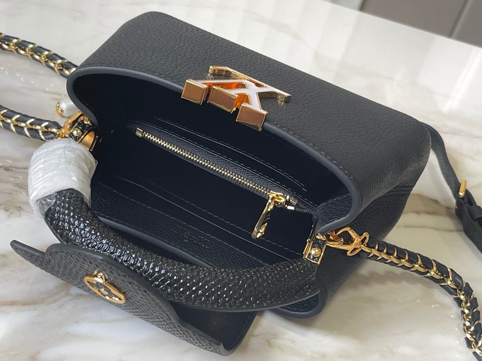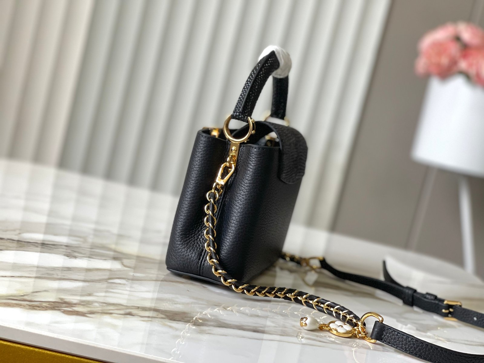 Découvrez l’élégance ultime avec le Sac Capucines Mini en cuir de luxe, un accessoire sophistiqué conçu pour celles qui recherchent la combinaison parfaite entre style raffiné et praticité. Sa taille compacte en fait le compagnon idéal pour toutes les occasions, tout en apportant une touche de distinction à votre tenue.