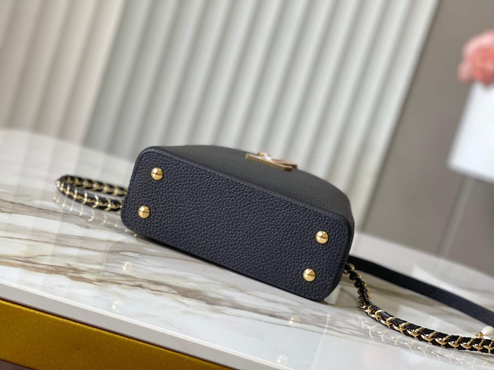 Le Sac Capucines Mini est réalisé en cuir véritable, nécessitant un entretien doux avec un chiffon humide et un produit d’entretien adapté. Son élégance réside dans ses détails minutieux et sa finition soignée, témoignant d’un savoir-faire artisanal exceptionnel. Un accessoire incontournable pour celles qui apprécient la qualité et le style.