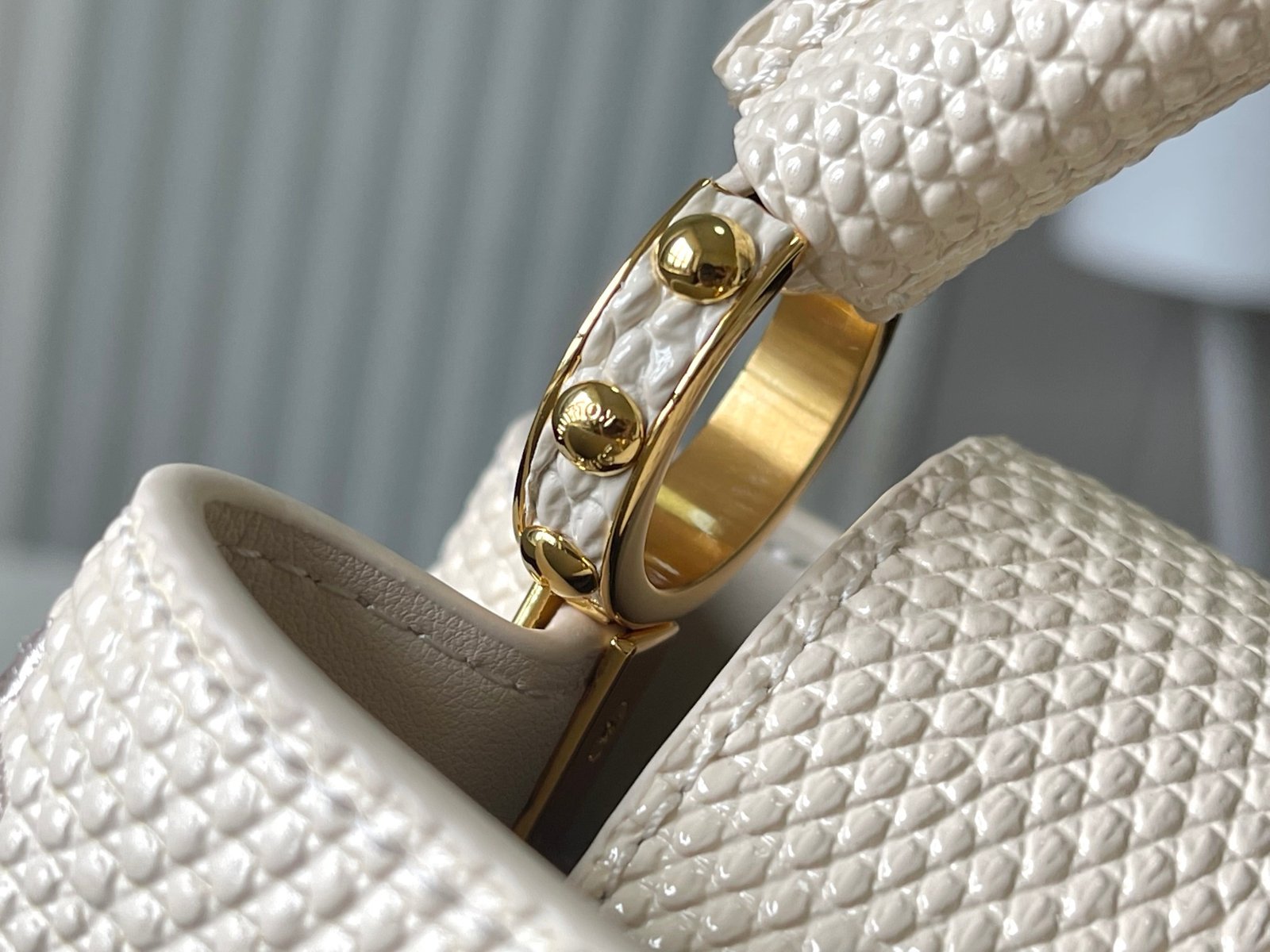 Ce sac Capucines Mini offre une combinaison parfaite de style et de praticité. Facile à porter à la main ou à l’épaule, il vous accompagne avec élégance tout au long de la journée ou de la soirée. Son design intemporel et ses finitions soignées en font un investissement mode durable, idéal pour enrichir votre collection d’accessoires de luxe.
