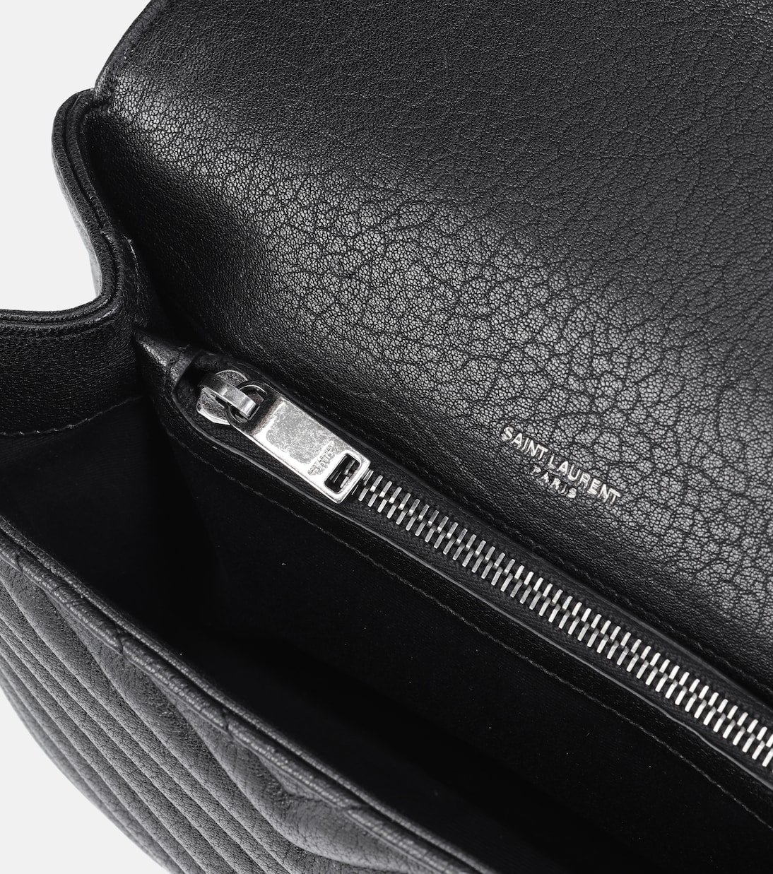 Saint Laurent retourne sur les bancs de l’école avec sa nouvelle gamme de sacs Collège. En cuir matelassé noir, ce modèle au format entre le cartable et l’enveloppe, est décoré des célèbres initiales YSL de la maison. Porté aussi bien à la main qu’à l’épaule grâce à sa bandoulière chaîne argentée, cet accessoire est à la fois simple et raffiné.