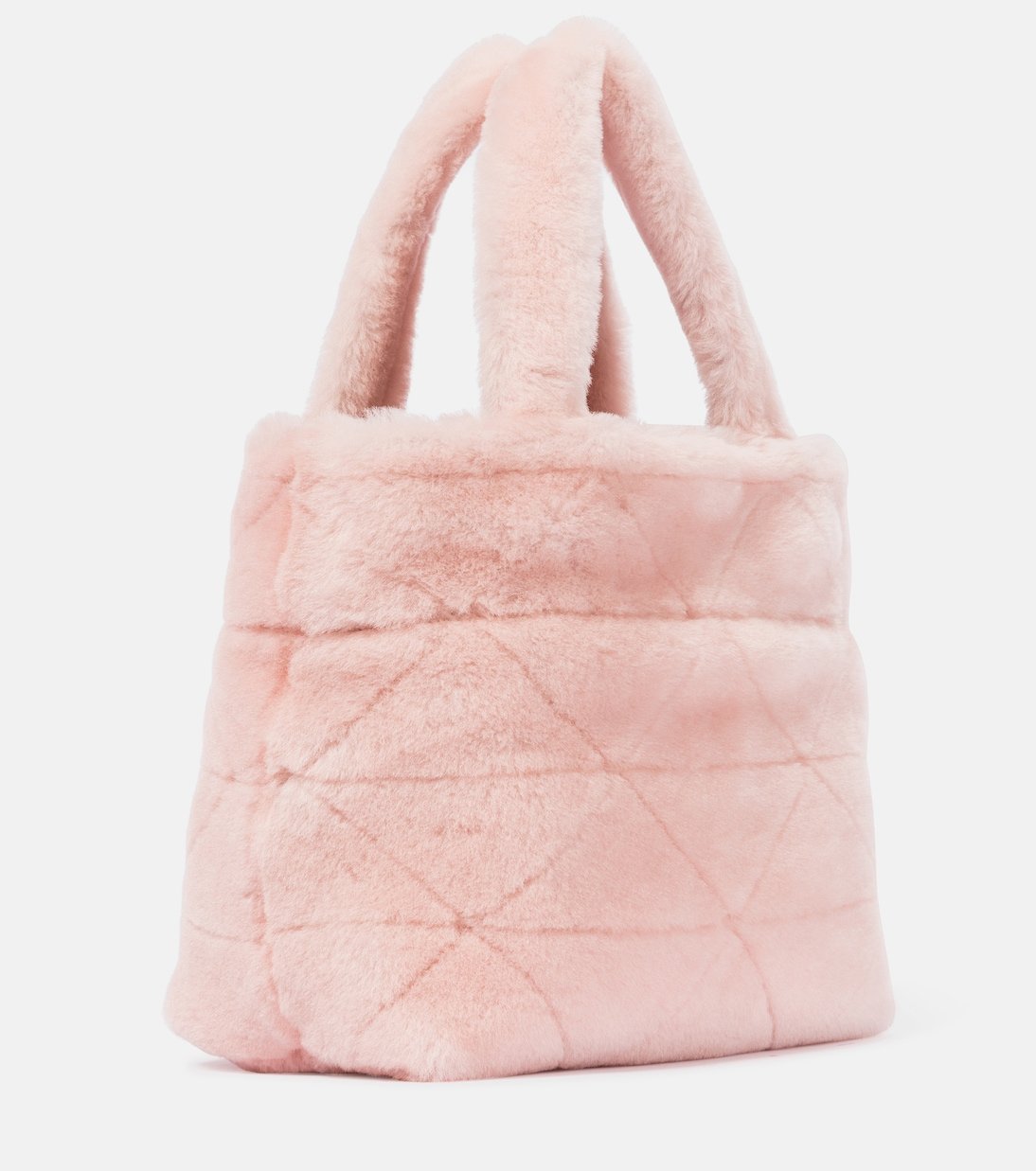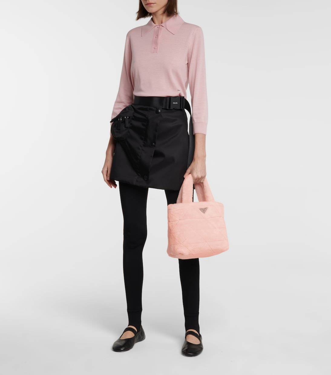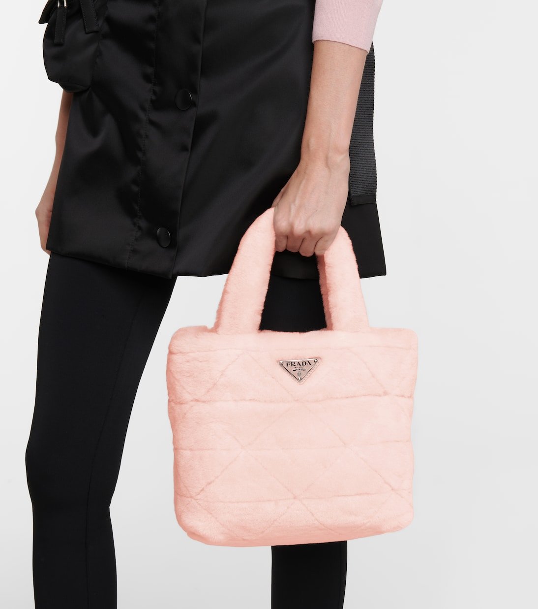 Prada signe un accessoire tactile et cosy avec ce tendre sac rose pâle. Fabriqué en Italie en shearling, ce modèle à la silhouette minimale se dote de poignées mais aussi d’une fine bandoulière optionnelle en cuir. Notez qu’il renferme une pochette séparable assortie, arborant elle aussi le célèbre appliqué à logo triangulaire.