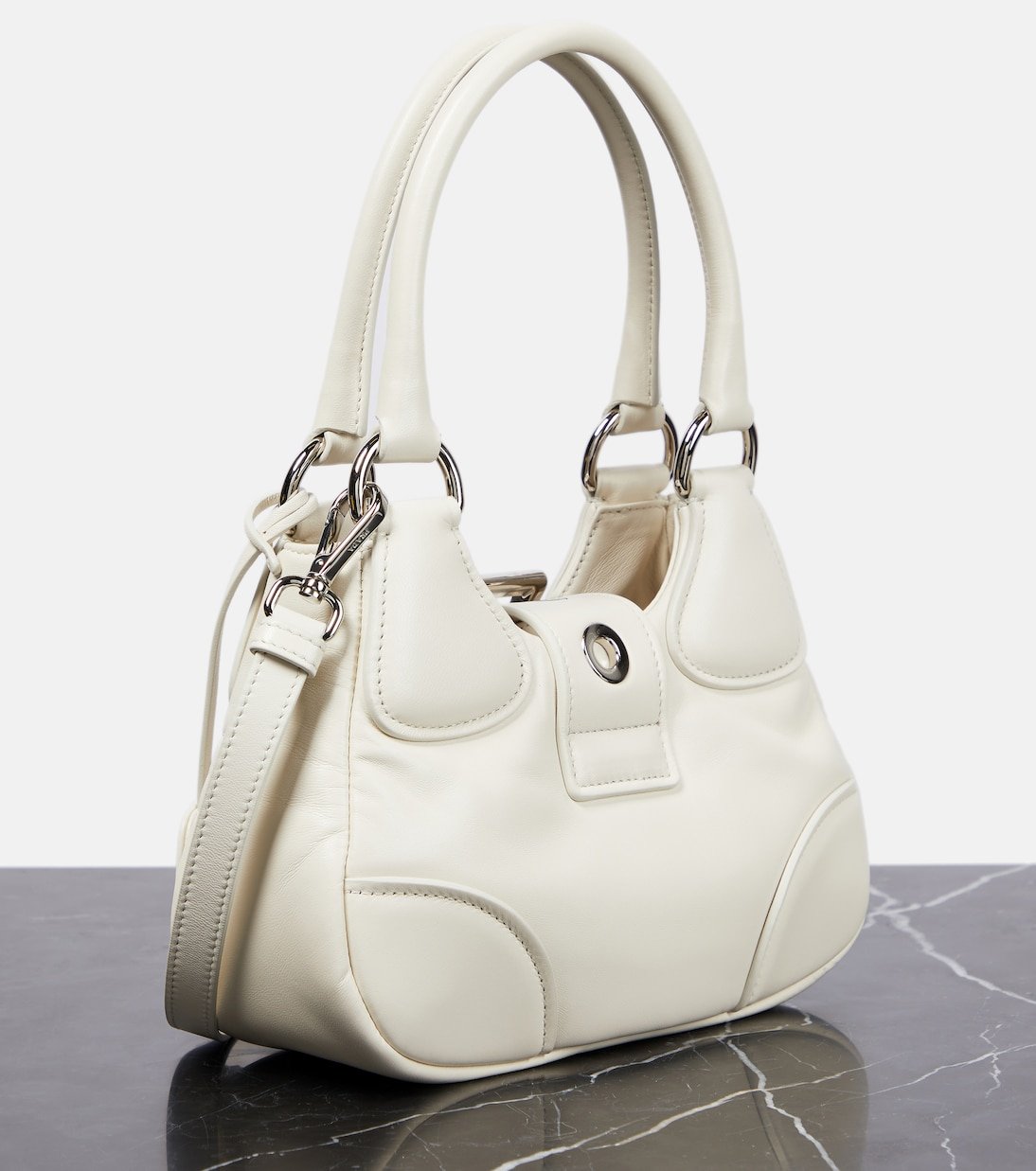 Le sac Moon de Prada se caractérise par son rabat à boucle orné d’un logo triangulaire ton sur ton. Réalisé en cuir nappa matelassé, ce petit modèle présente une silhouette structurée avec des anses supérieures, une bandoulière amovible et un porte-clés.