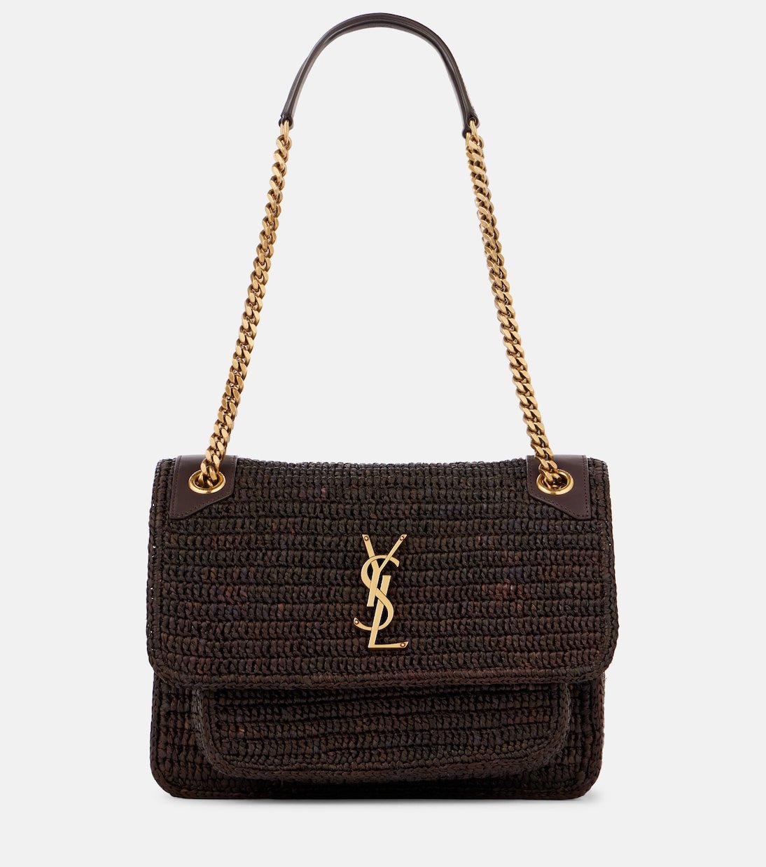 Depuis sa création en 1961, Saint Laurent est plébiscité pour son esthétique parisienne élégante. Le sac Niki Medium réinvente une icône de la maison en raphia, mêlant une texture décontractée à un design raffiné et structuré.