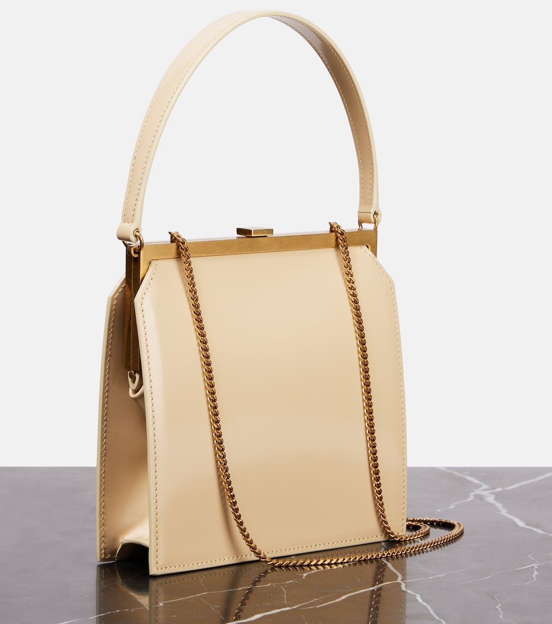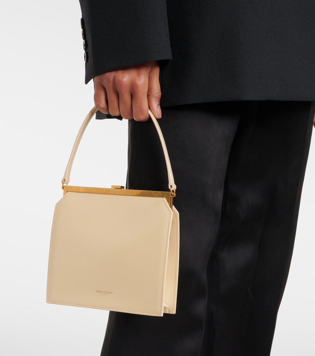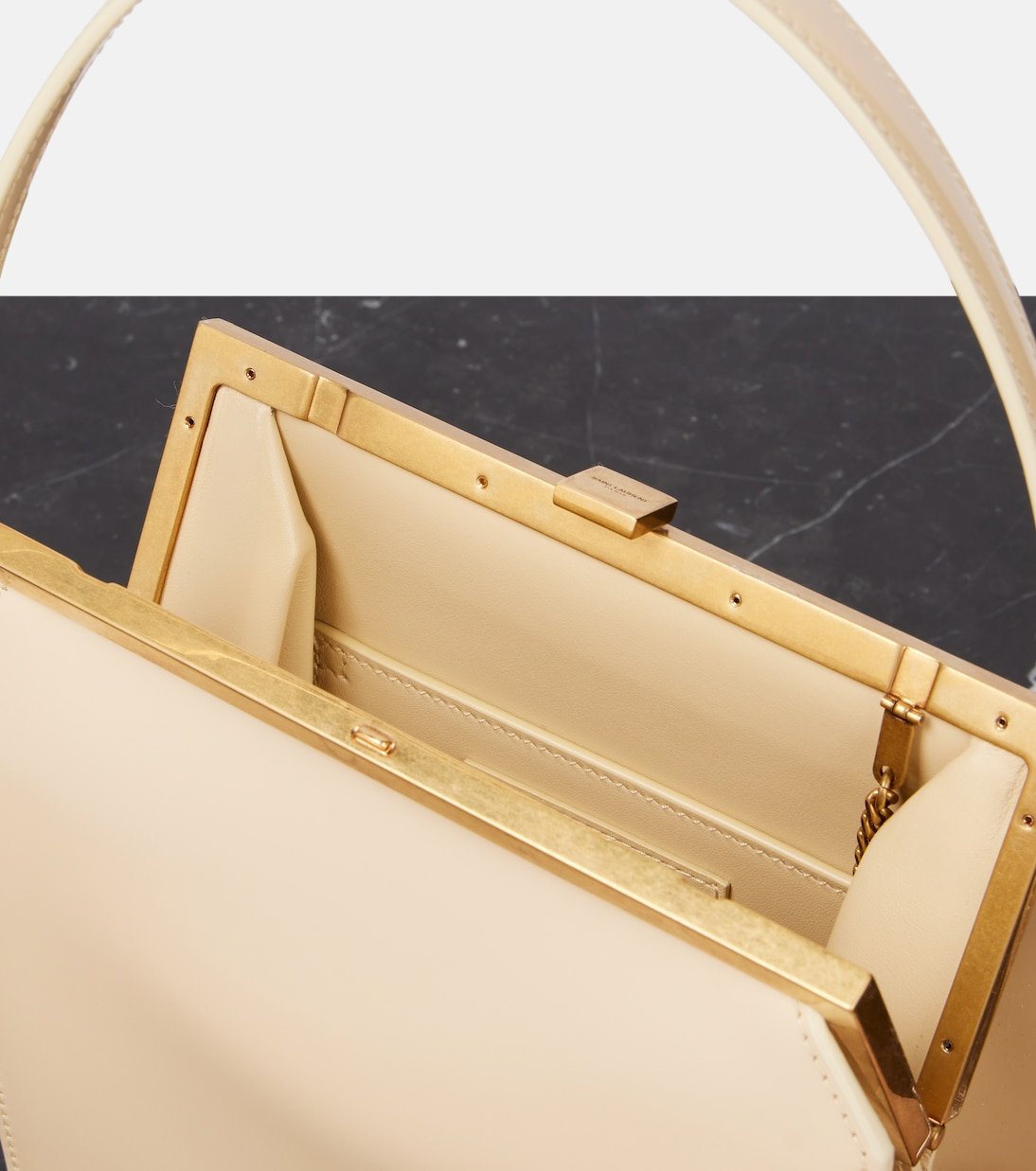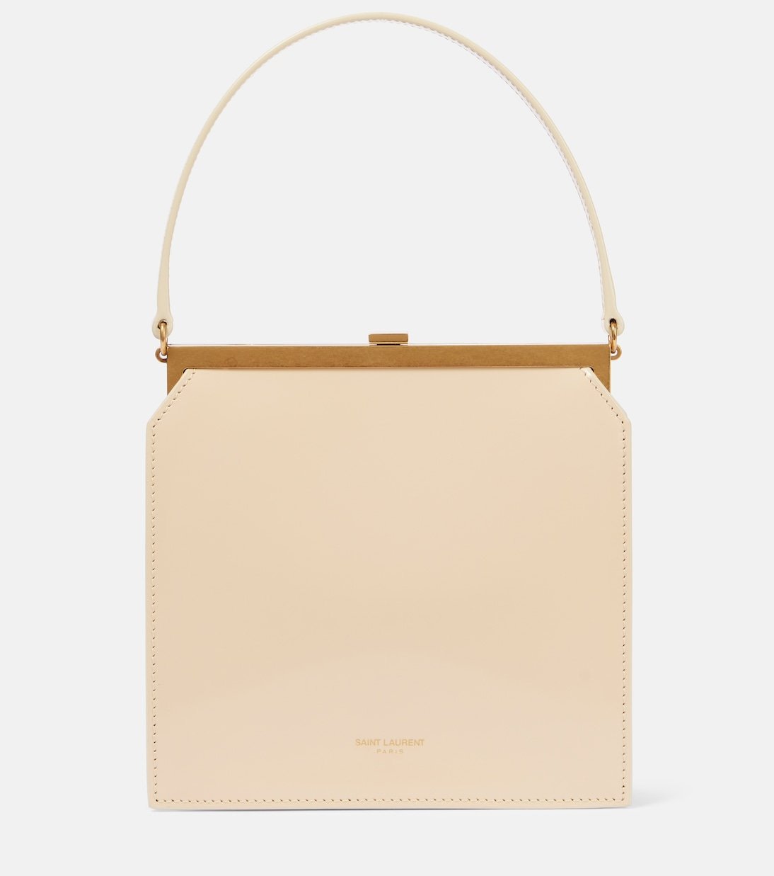 Depuis sa création en 1961, la maison Saint Laurent est convoitée pour son élégante esthétique parisienne. Le sac Nuit Blanche a été confectionné en Italie à partir de cuir blanc agrémenté de finitions en métal doré.