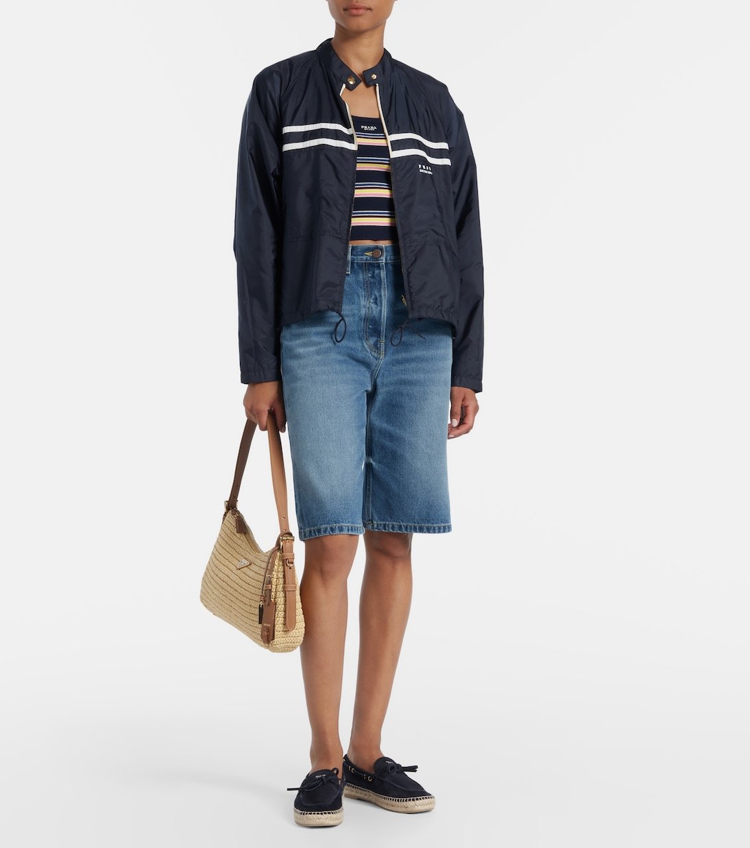 Le sac Aimée Large de Prada est crocheté en fil effet raphia et dispose de sangles et de bords en cuir. Ce modèle est rehaussé d’un sac à charm amovible et du logo triangulaire du label sur le devant.