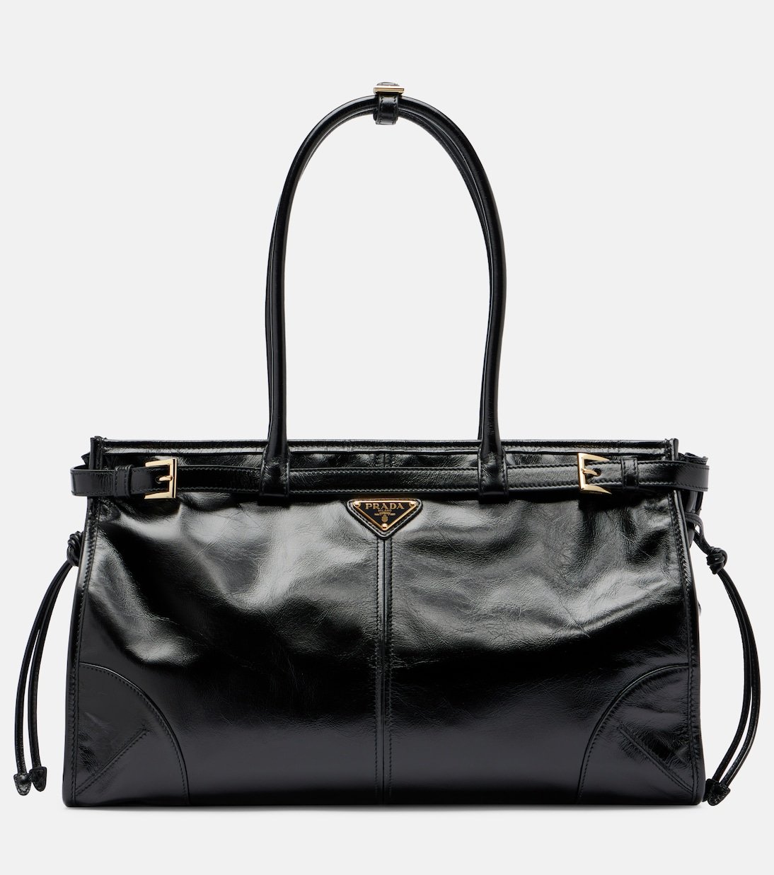 Confectionné en cuir brillant, le sac Bonnie Large présente une silhouette allongée, une boucle et un logo triangulaire emblématique. Prada revisite l’héritage italien dans une direction résolument moderne avec une approche épurée et avant-gardiste.