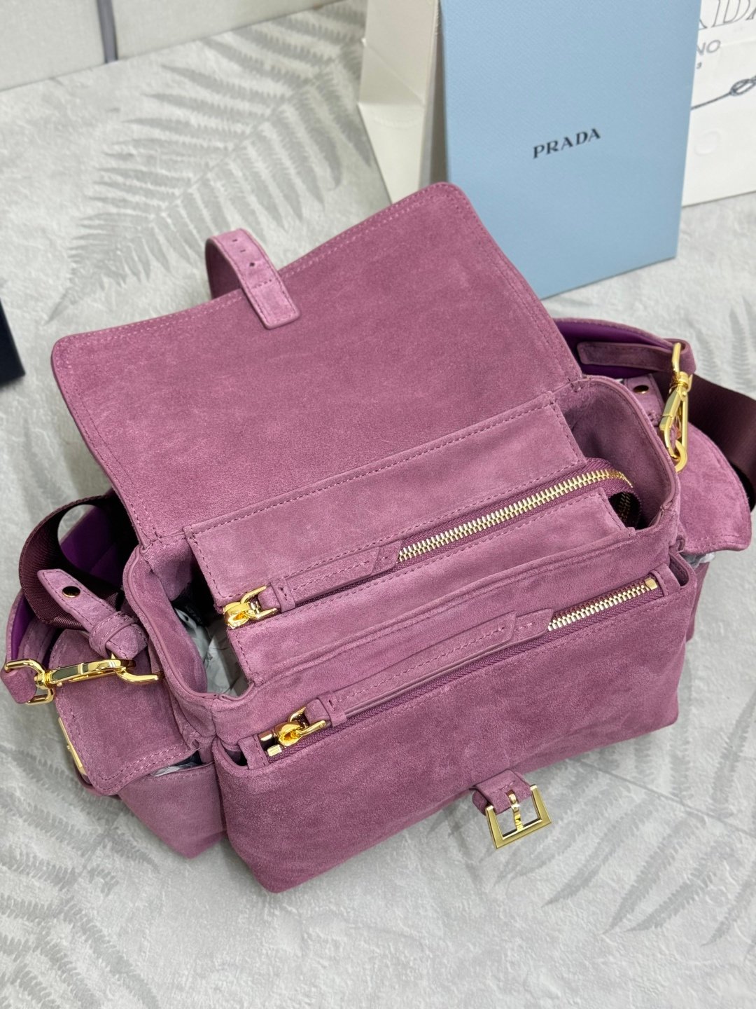 Ce sac Prada en daim est un indispensable de la maroquinerie de luxe, idéal pour affirmer une allure sophistiquée avec modernité.