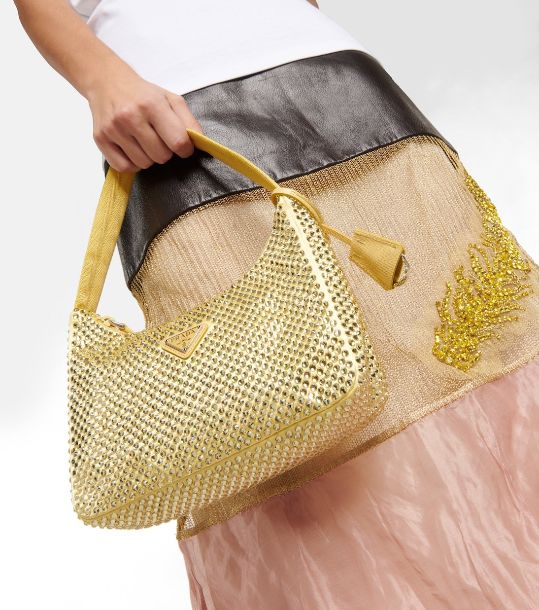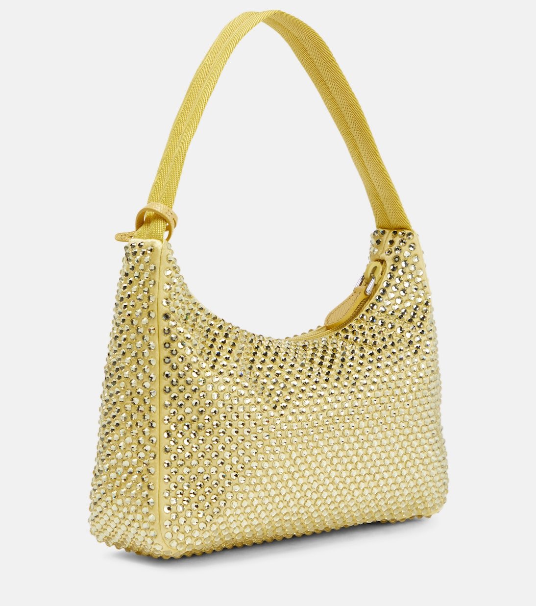 Remontez le temps avec ce sac Prada rétro, une réédition d’un modèle lancé dans les années 2000. L’accessoire en satin est parsemé de petits cristaux.