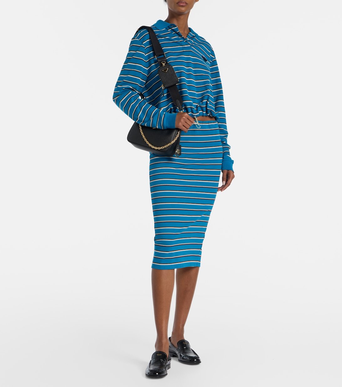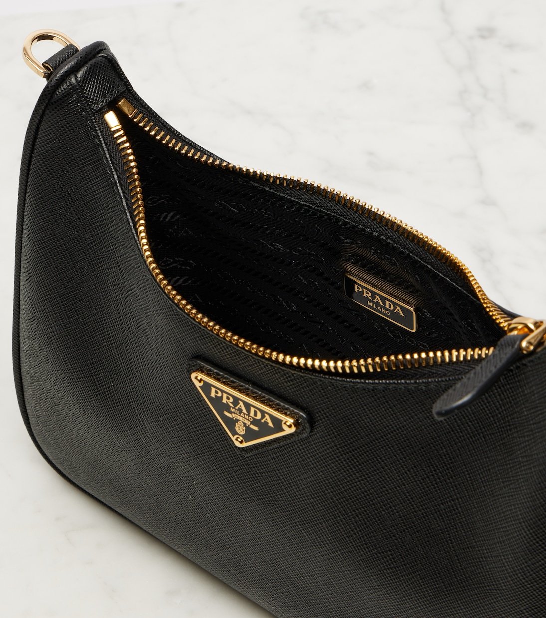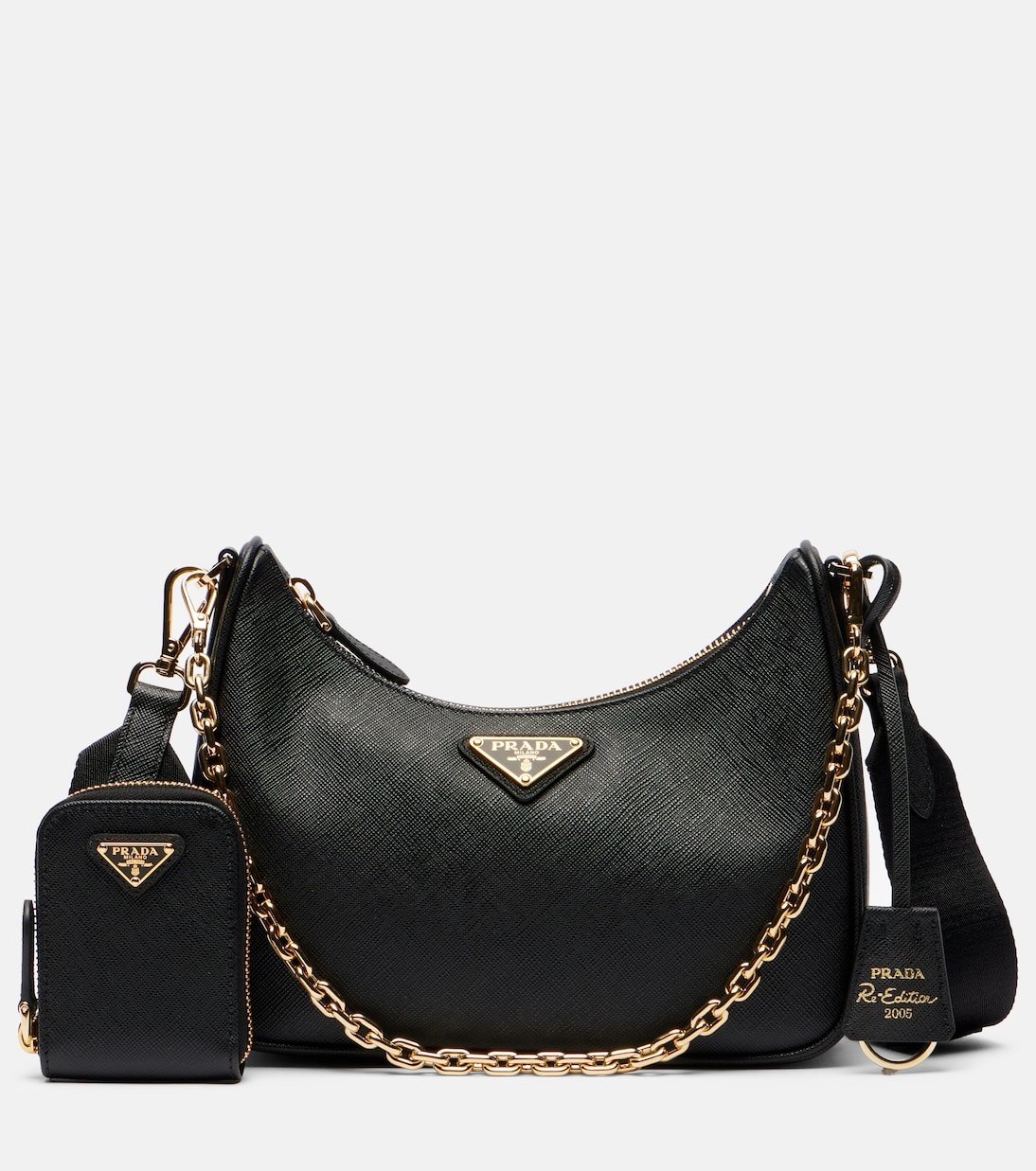 Prada revisite l’héritage italien dans une direction résolument moderne avec une approche épurée et avant-gardiste. Réalisé en cuir noir, le sac Re-Edition 2005 est doté d’une pochette zippée assortie, de finitions métalliques dorées et d’une bandoulière chaîne amovible.