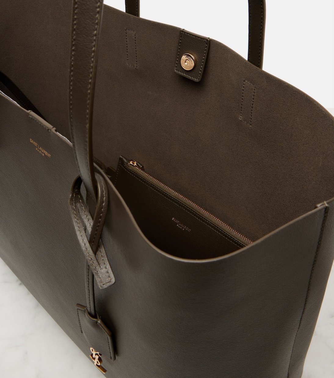 Simplifiez-vous la vie avec le sac Shopping Large en cuir de Saint Laurent. Ce modèle est doté d’anses supérieures pratiques, d’une pochette amovible et du charm Cassandre signature du label.