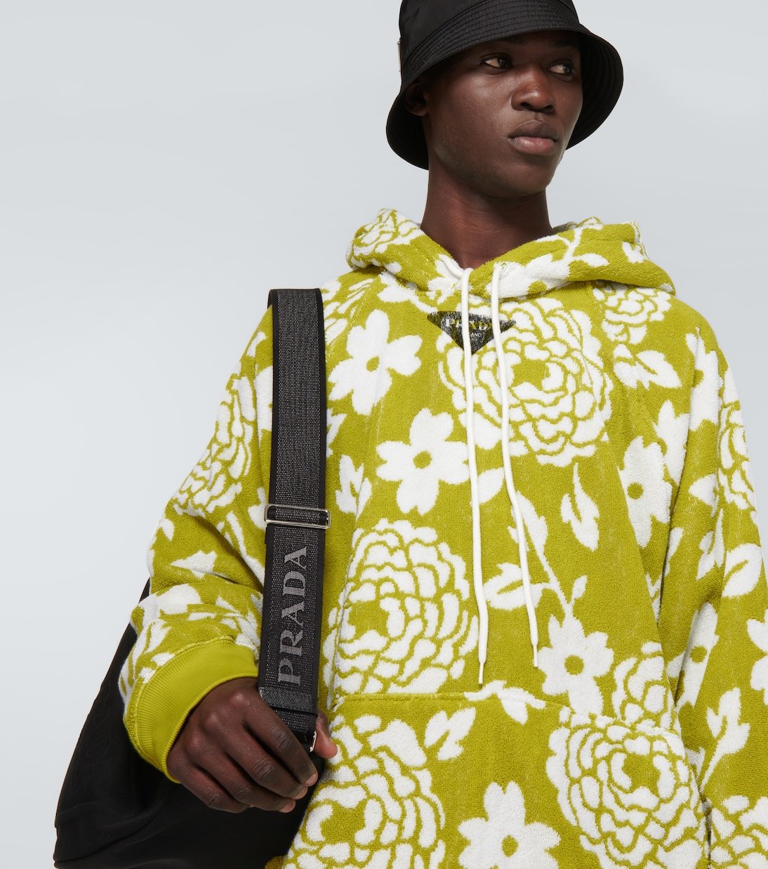 Confectionné en éponge de coton doux, ce sweat-shirt à capuche vert tilleul de Prada adopte une silhouette décontractée rehaussée d’un motif floral intégral et printanier.