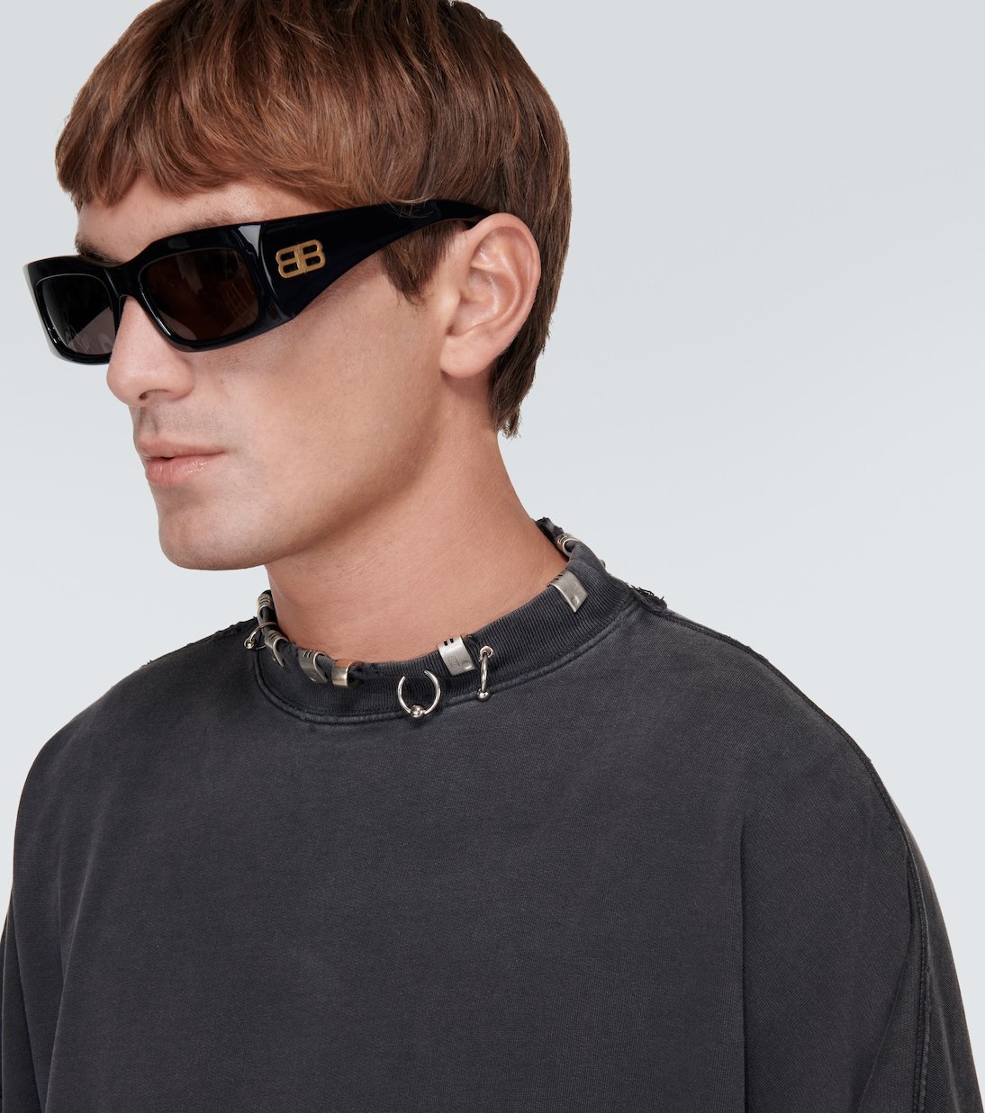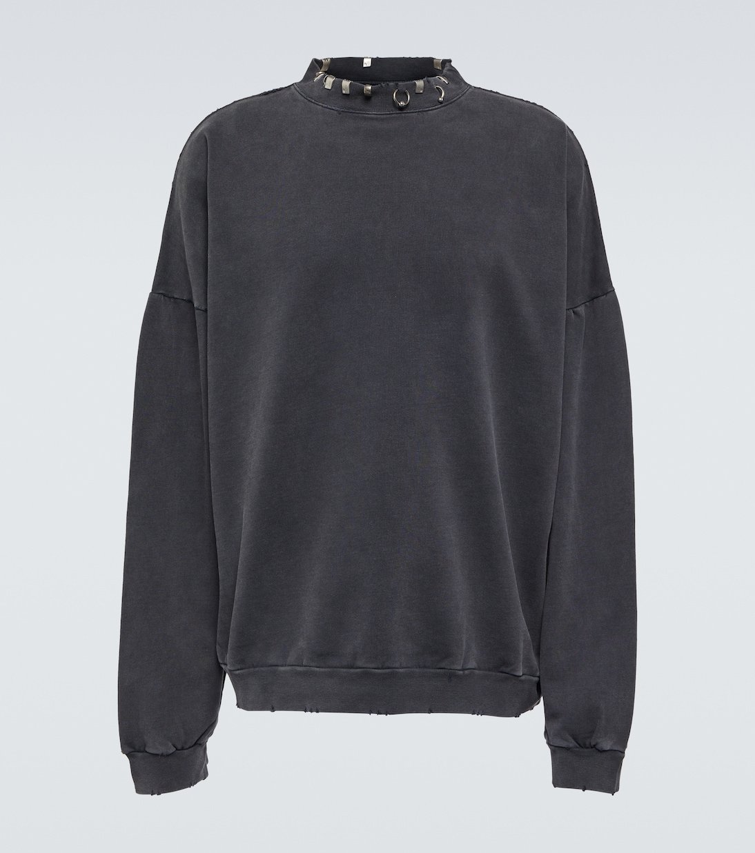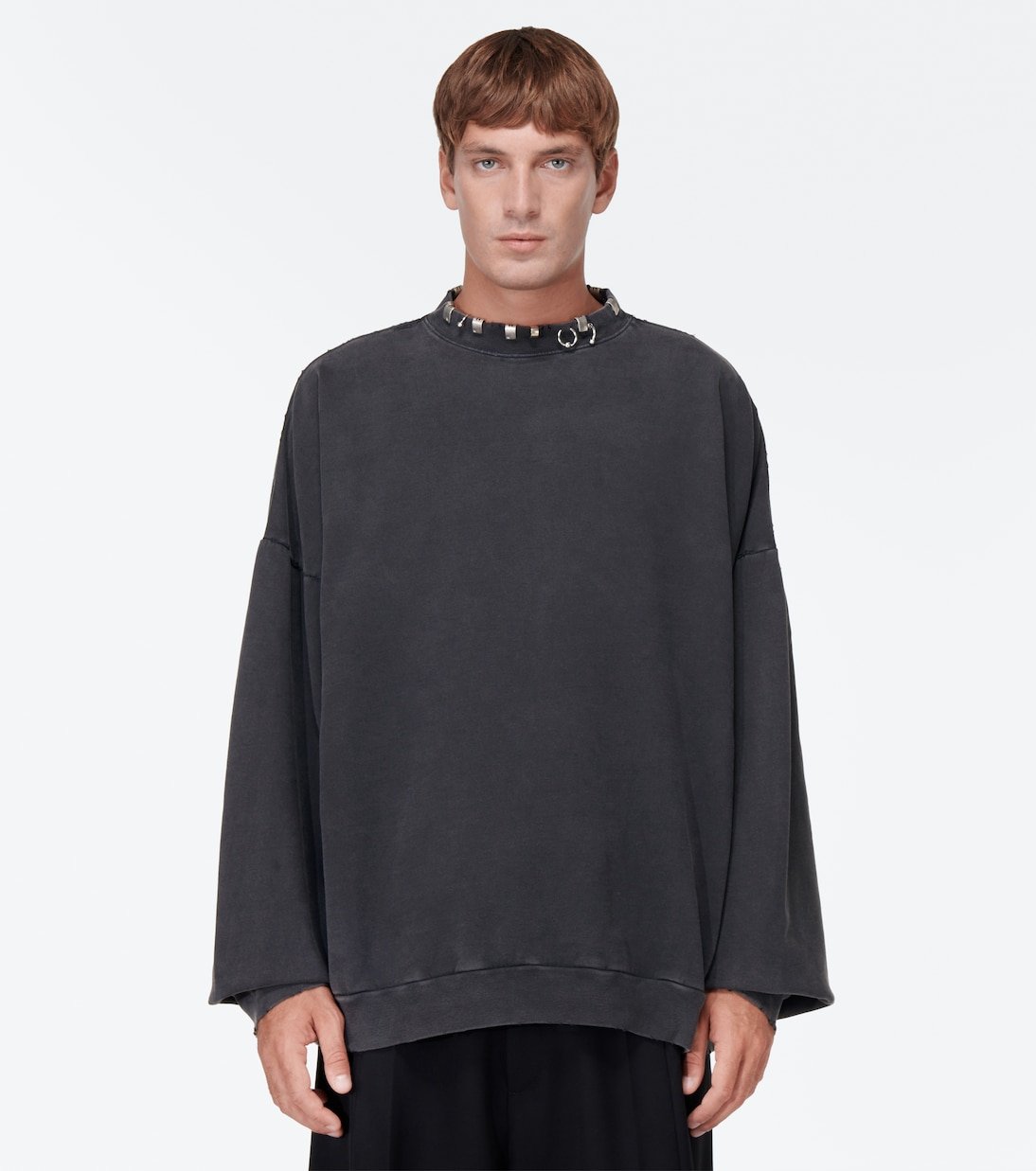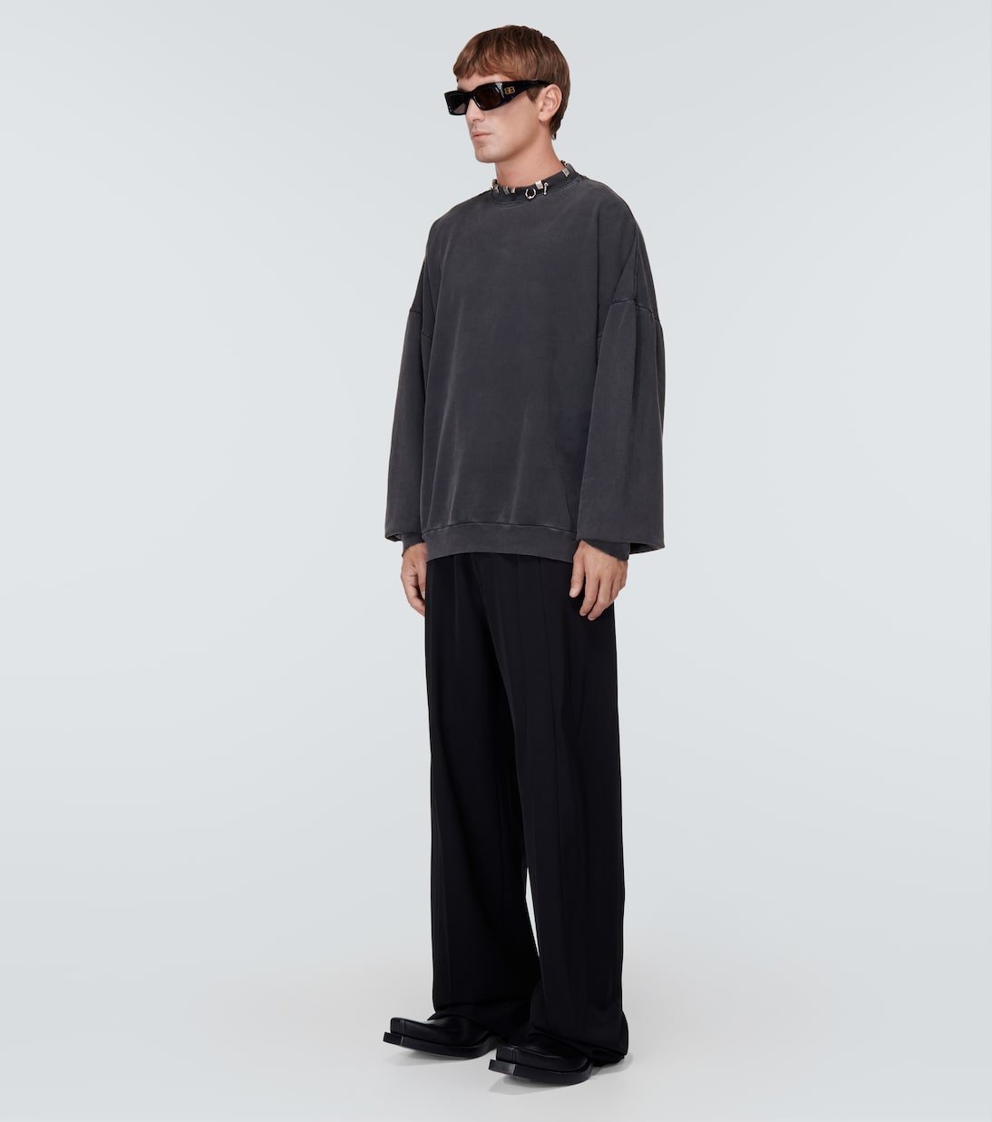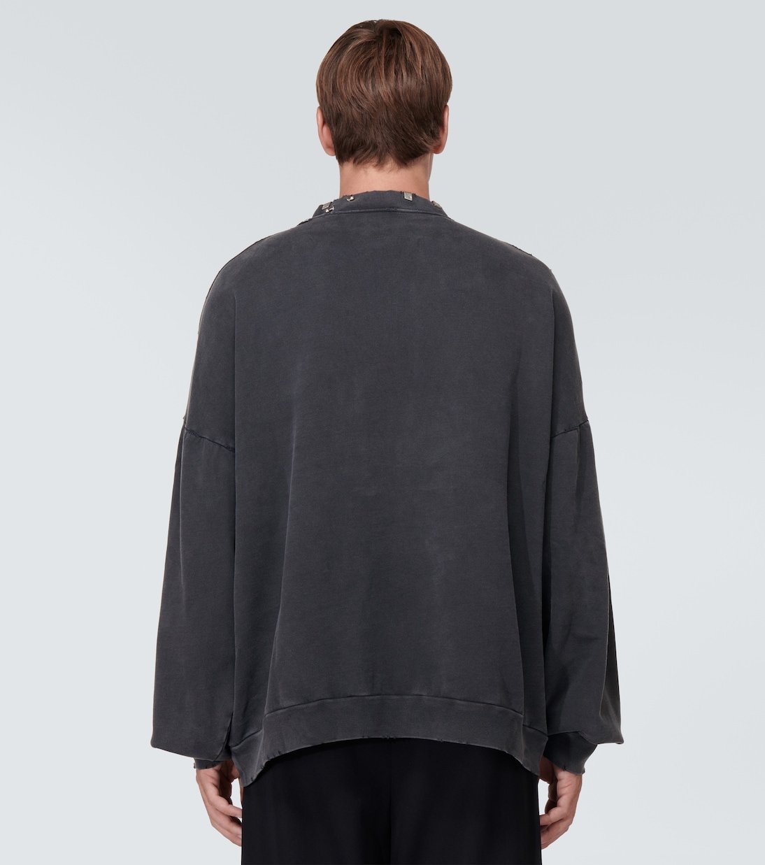 Balenciaga signe ce sweat-shirt en molleton de coton noir. Ce modèle décontracté et dans l’air du temps esquisse une coupe oversize et se pare d’une encolure ornée d’anneaux argentés.