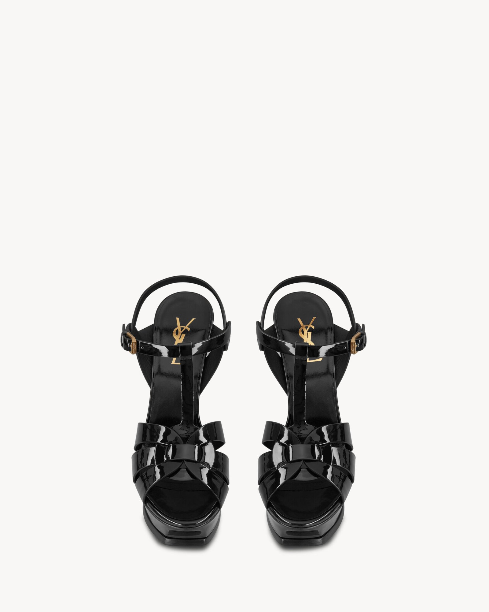 Sandales à talon aiguille haut recouvert munies de brides entrecroisées, d’une plateforme biseautée et d’une bride cheville ajustable gravée Saint Laurent Paris.