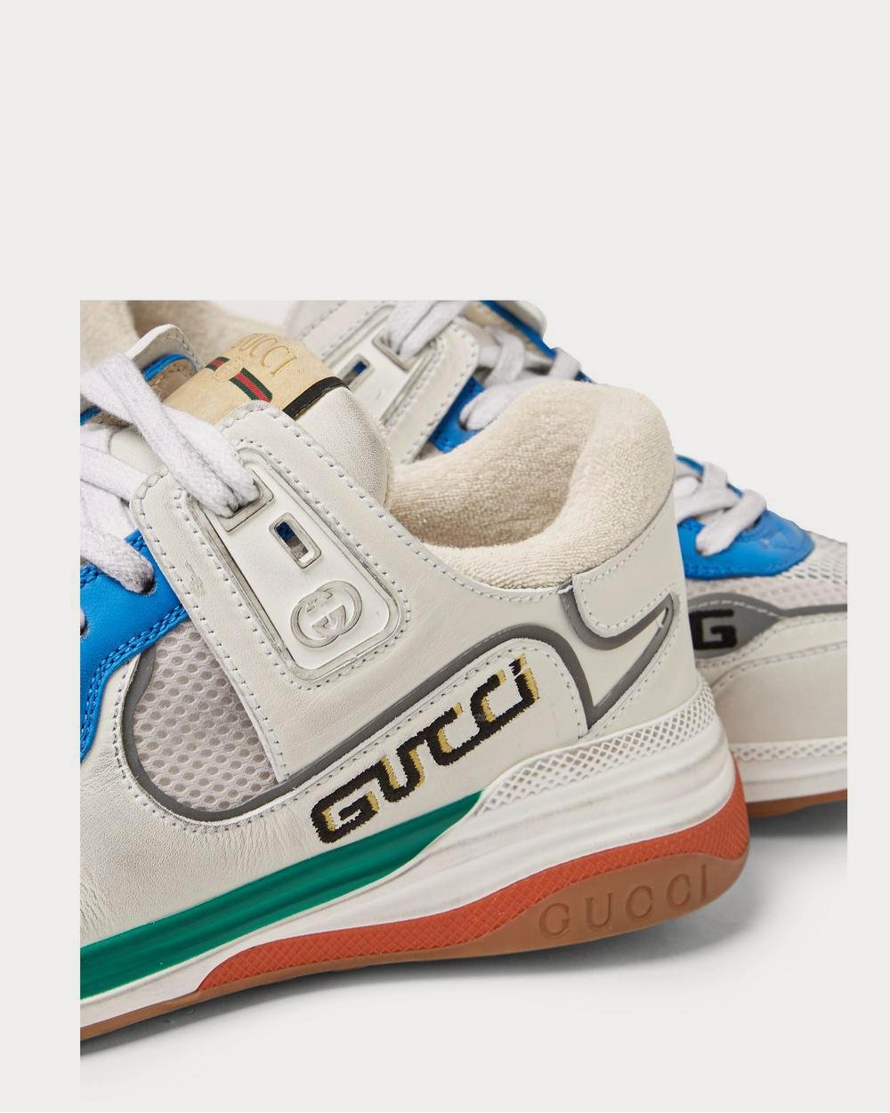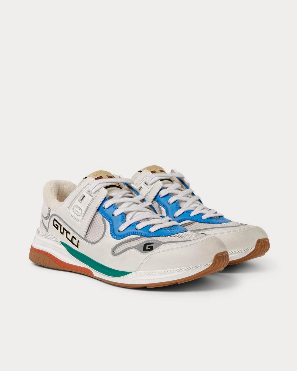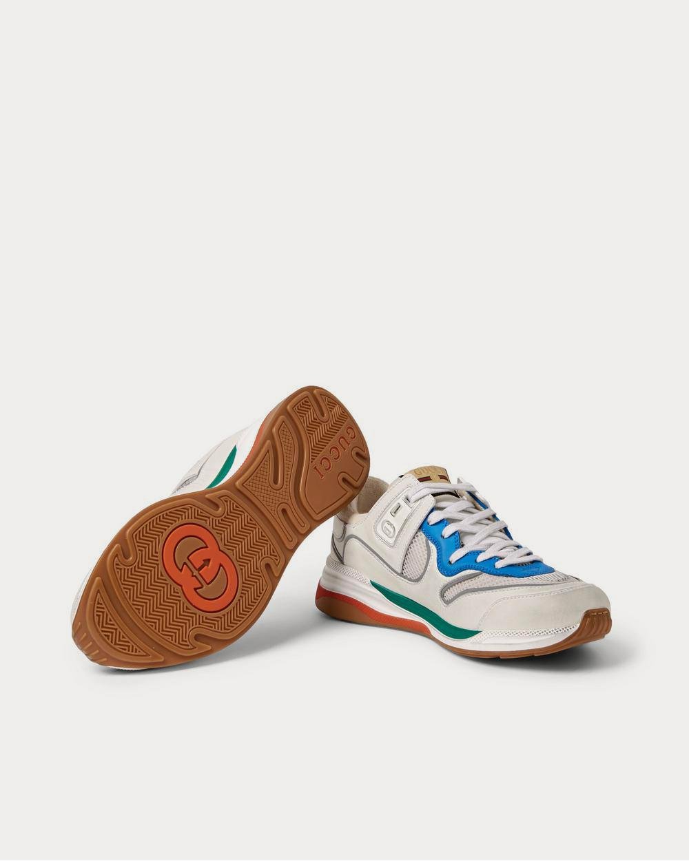 Les baskets « Ultrapace » de Gucci s’inspirent des chaussures de sport vintage des années 80 et arborent des motifs tout aussi rétro. Confectionnées en mesh et cuir vieilli avec des finitions argentées réfléchissantes, elles sont doublées de tissu éponge confortable et reposent sur des semelles intermédiaires en caoutchouc tricolores.