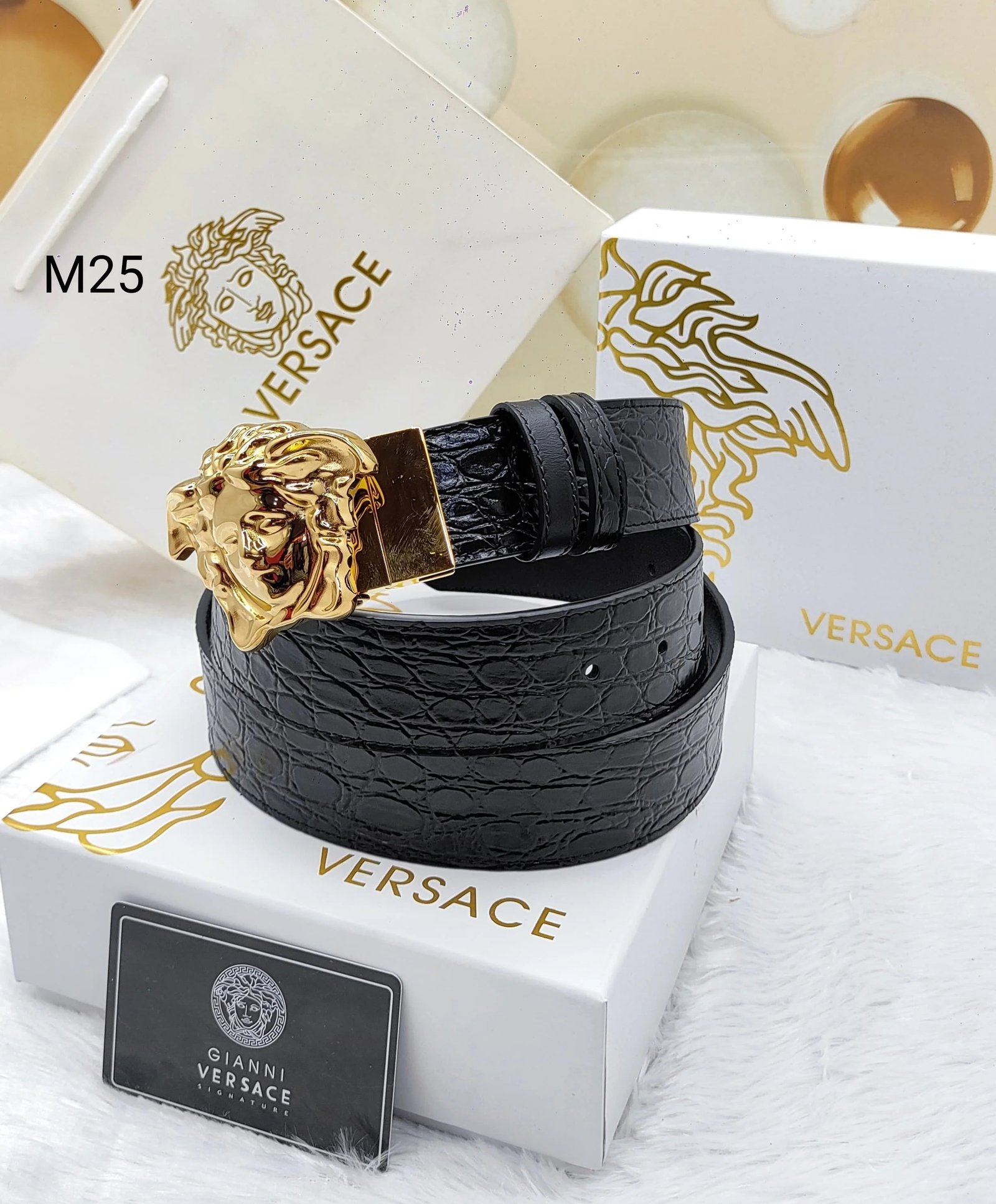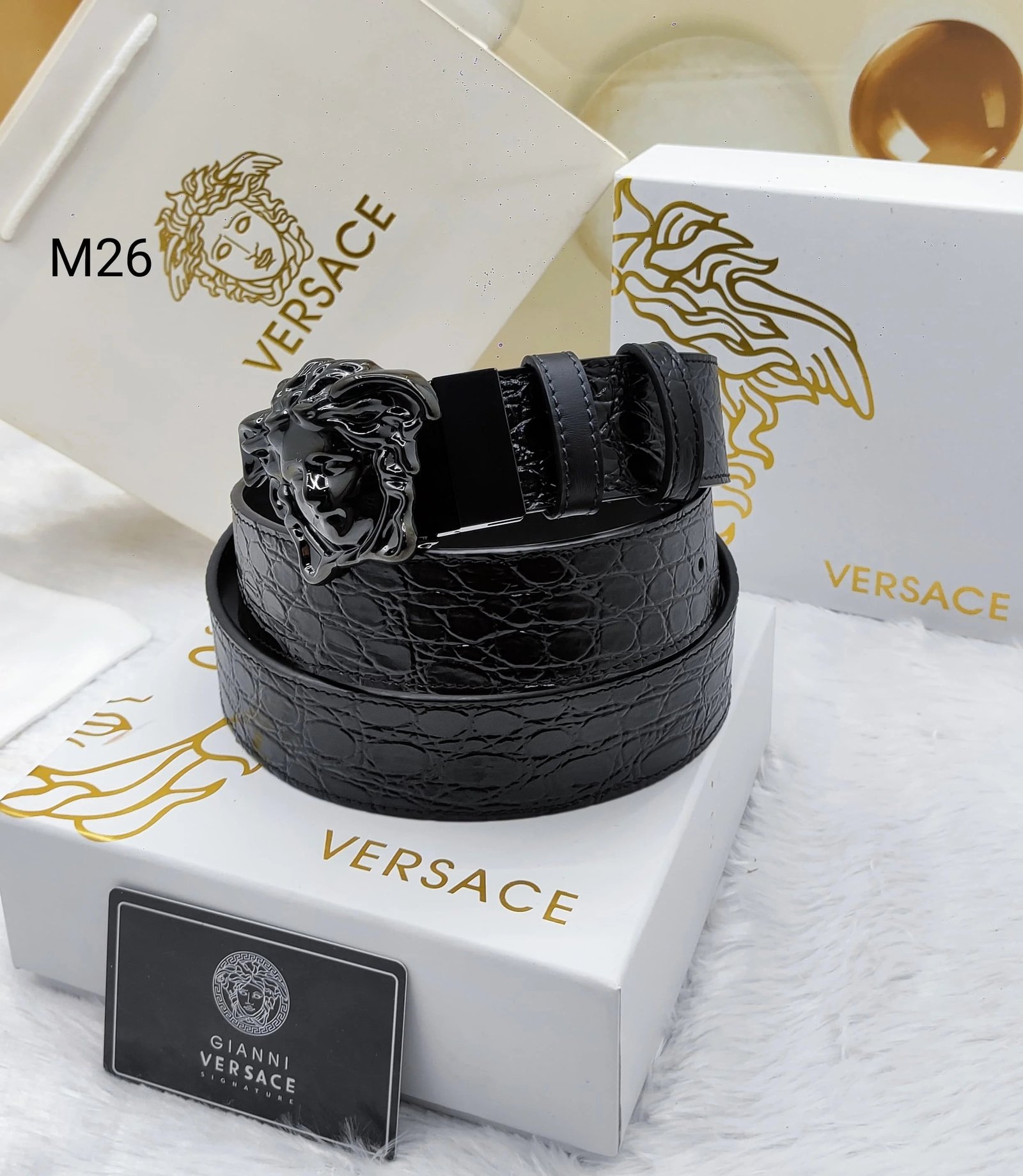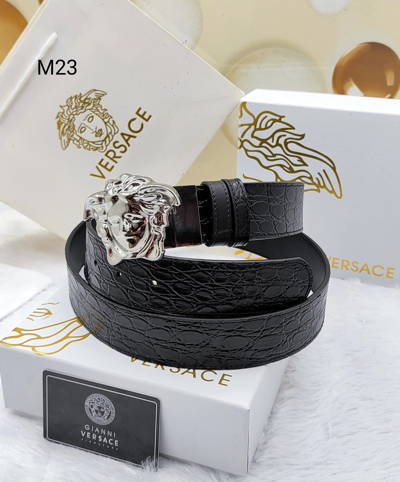 Confectionnée par la célèbre maison Versace, cette ceinture en cuir à tête de Méduse respire le luxe et le style. Avec son ornement emblématique en forme de tête de Méduse et son cuir de haute qualité, cette ceinture est l’accessoire idéal pour sublimer n’importe quelle tenue. Affirmez votre style avec cette pièce élégante et intemporelle.