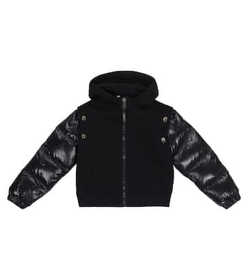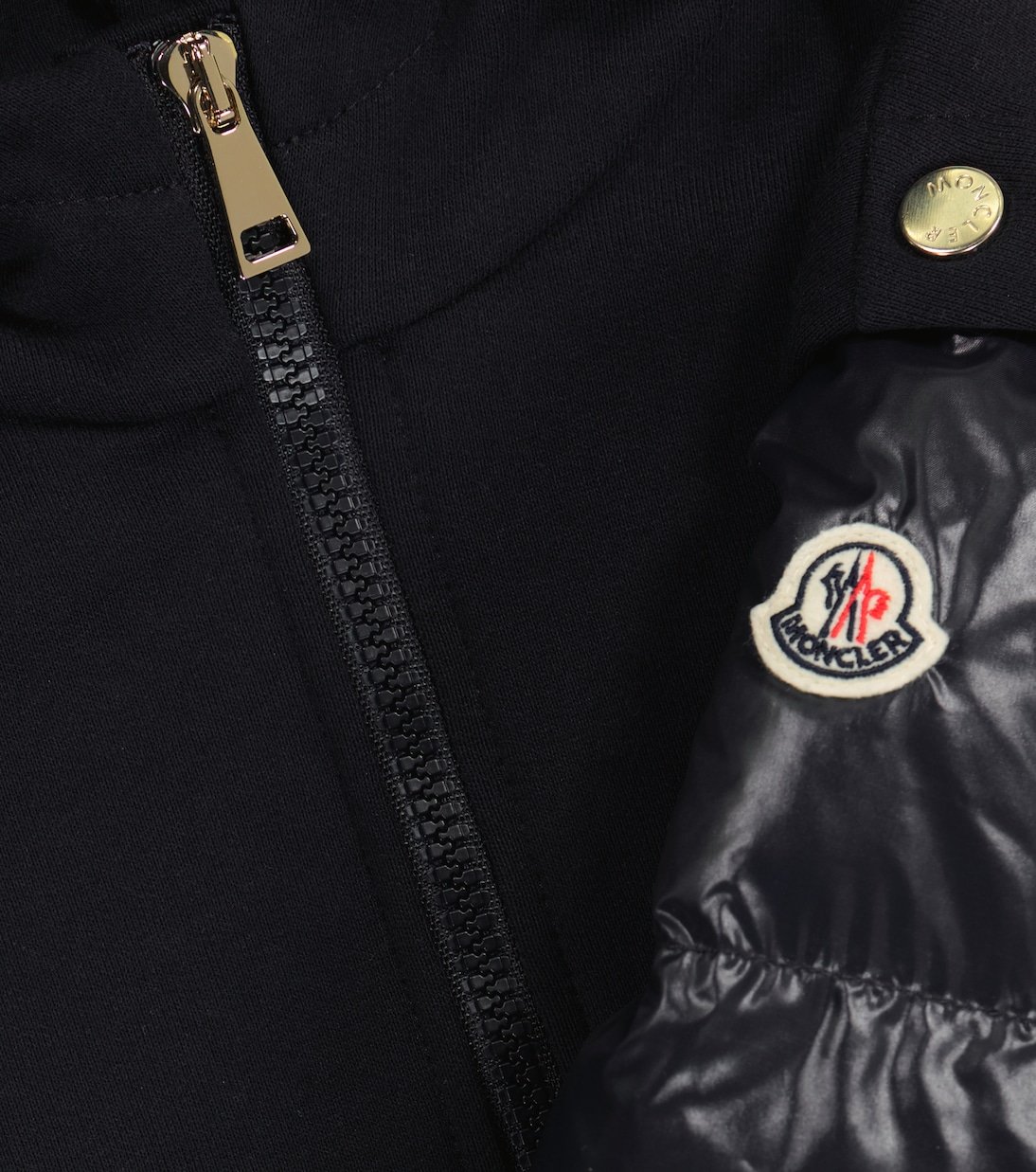 Cette veste à capuche Moncler Enfant est une version revisitée d’un modèle hybride : elle est confectionnée en coton et possède des manches doudoune amovibles.