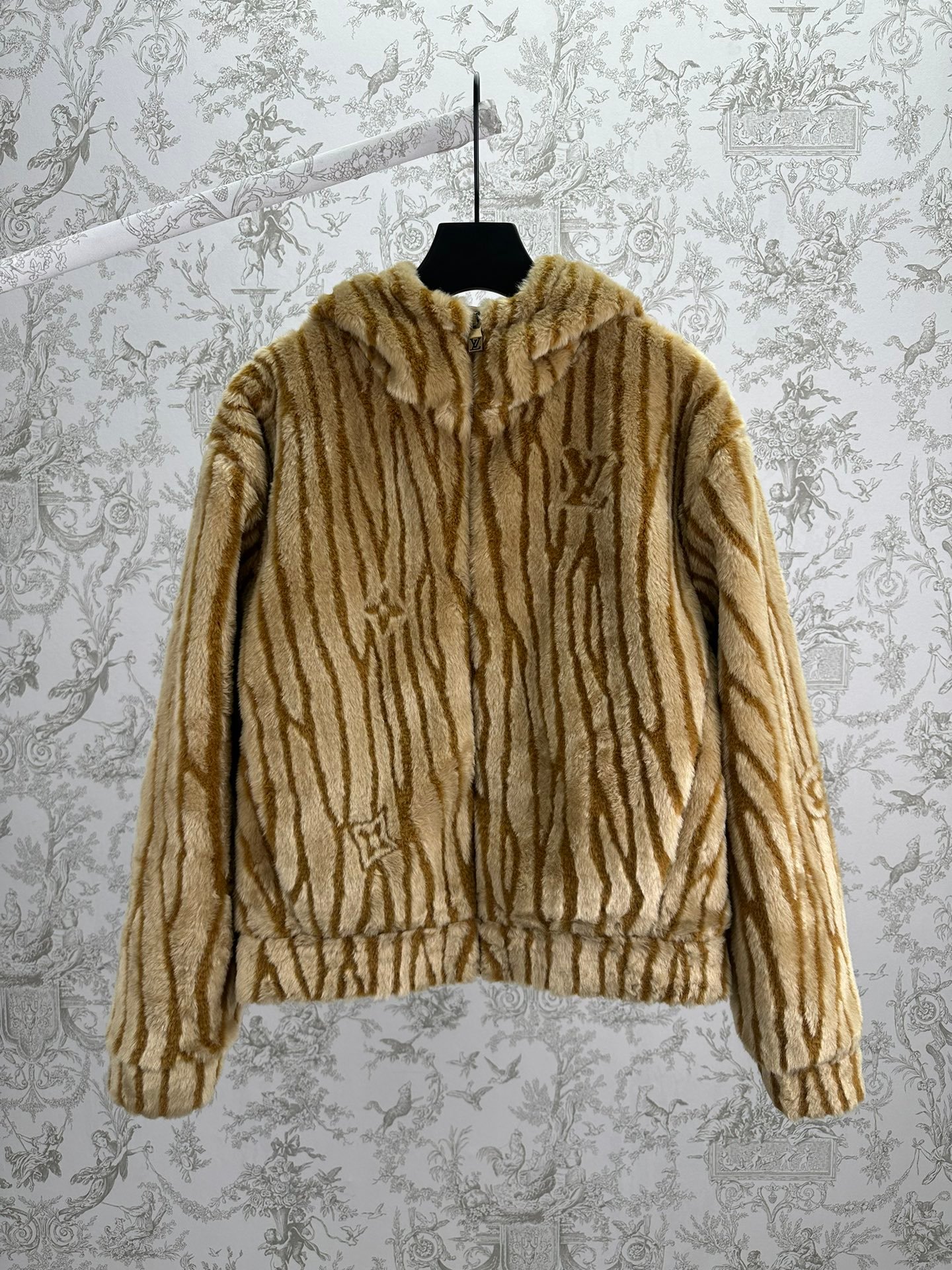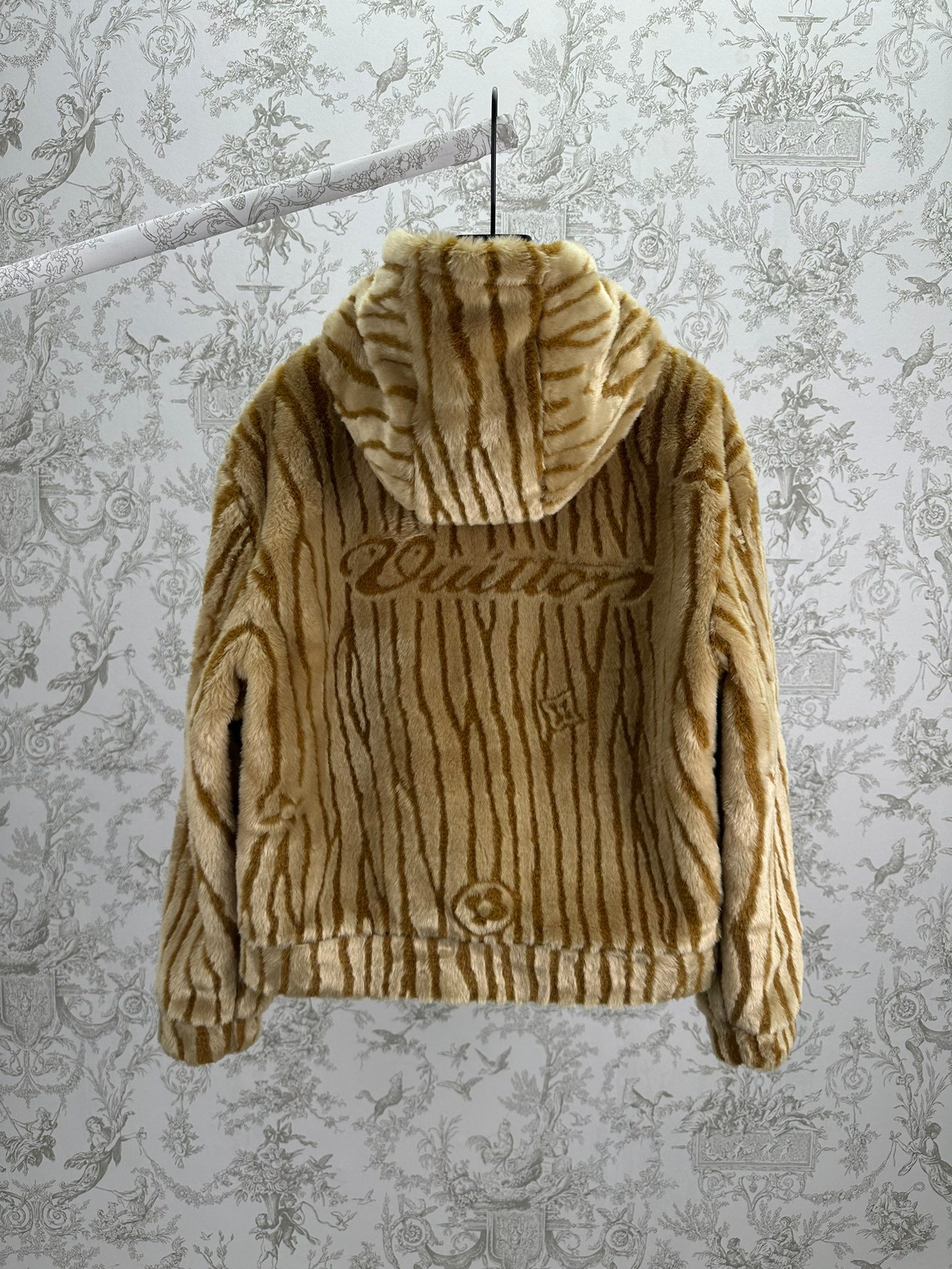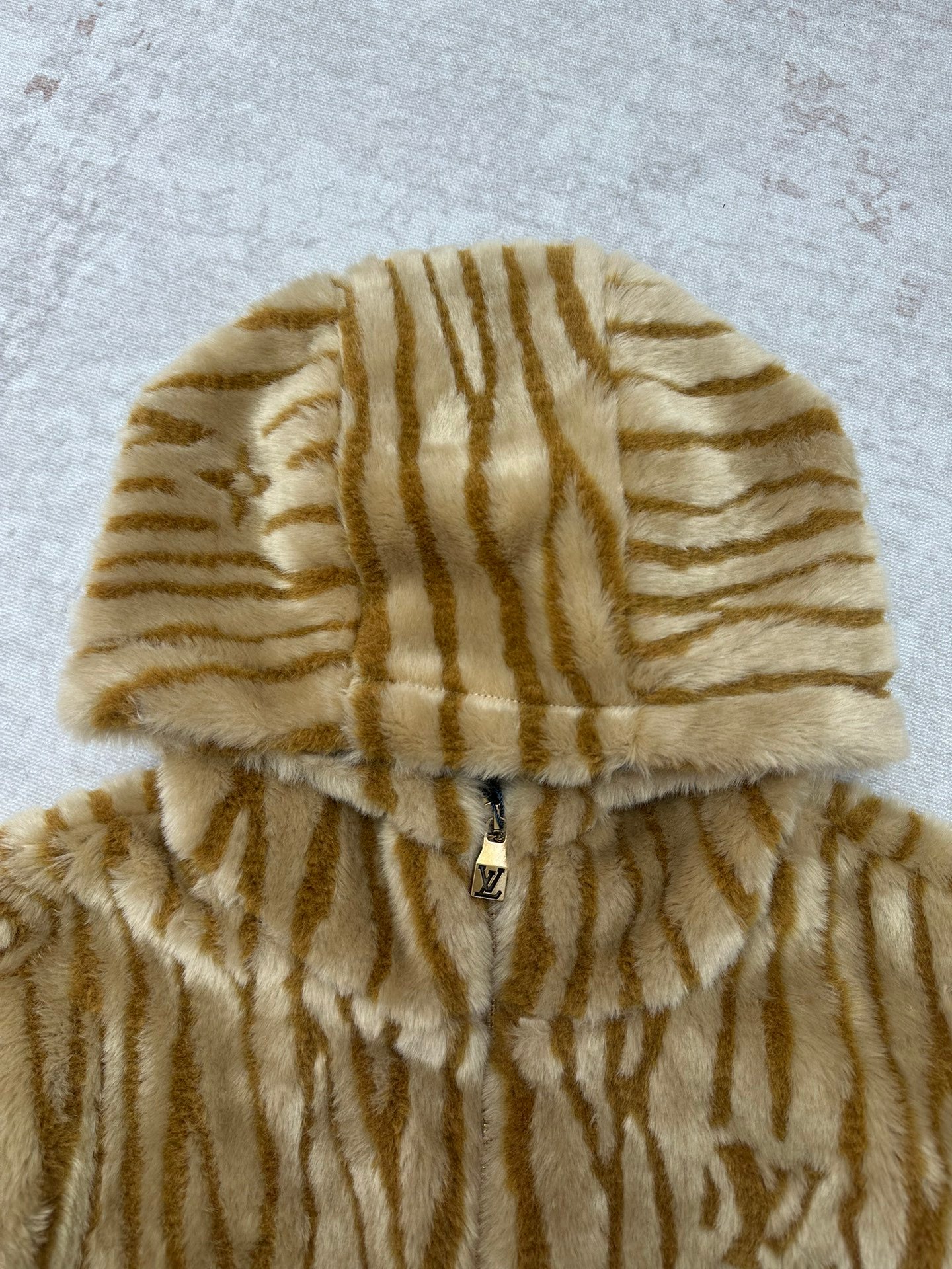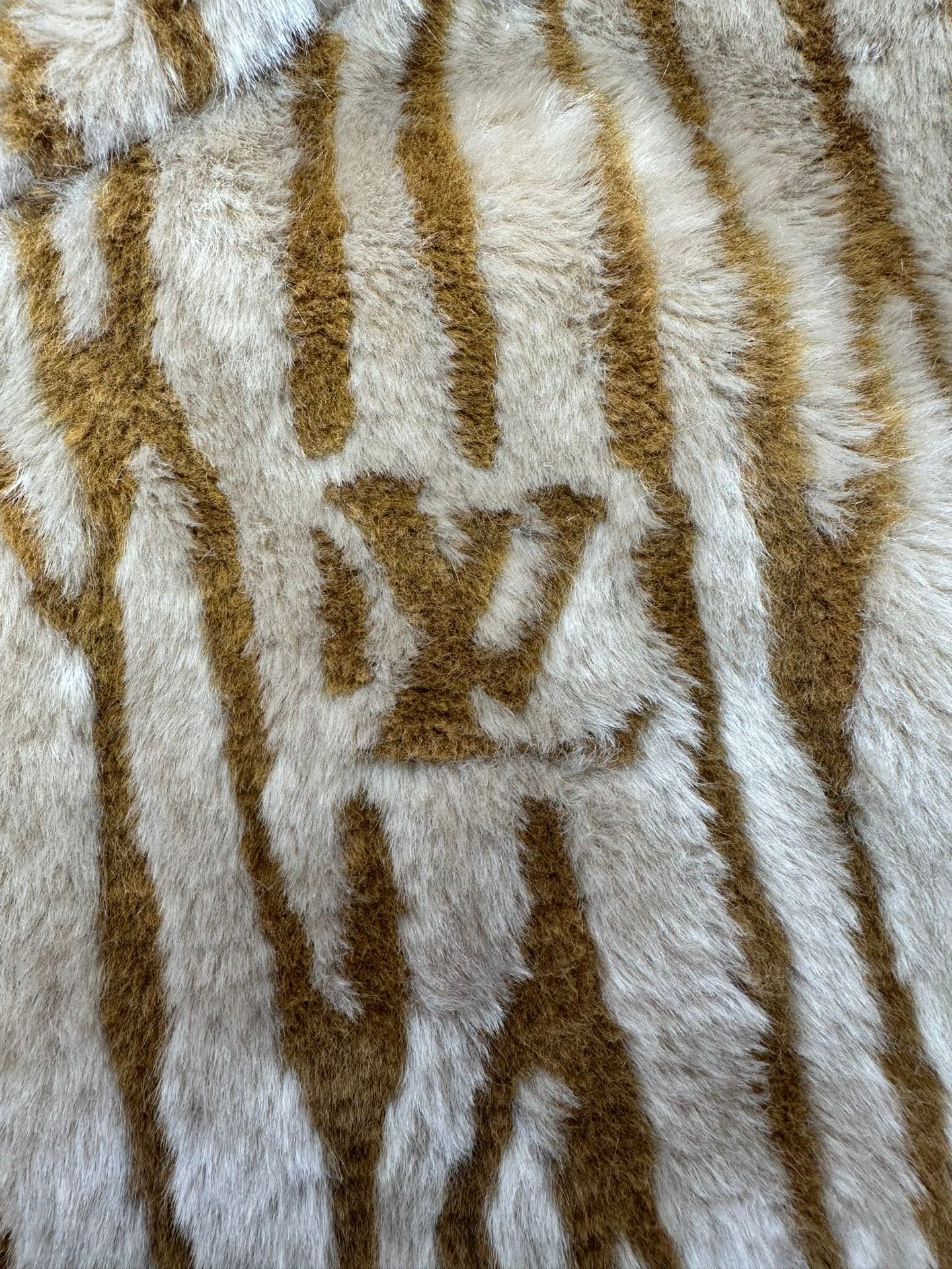 - Design emblématique : Motif Monogram Louis Vuitton sur une fourrure synthétique douce, alliant luxe et praticité.
