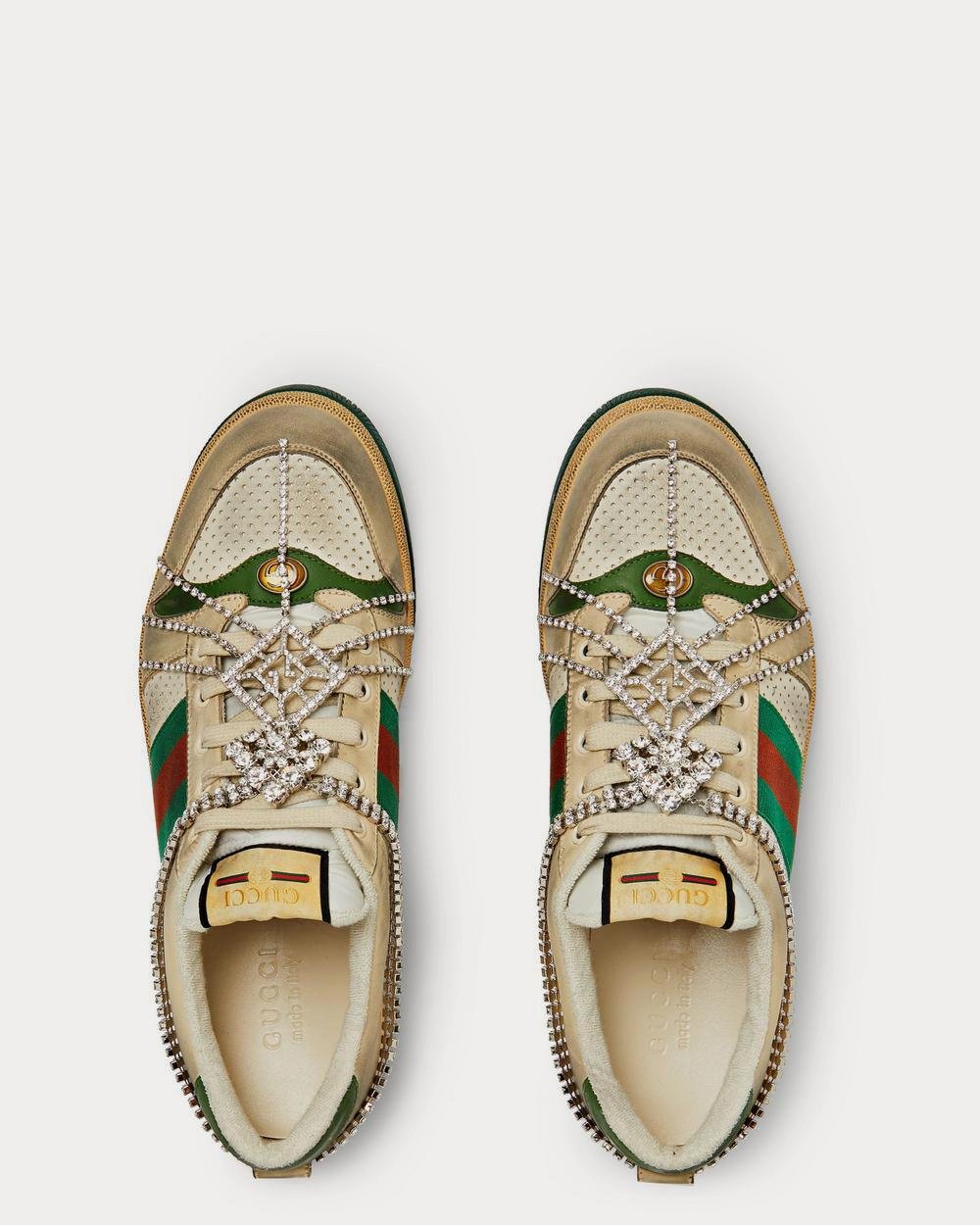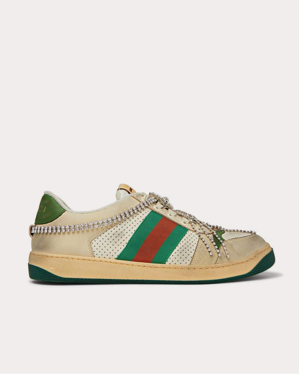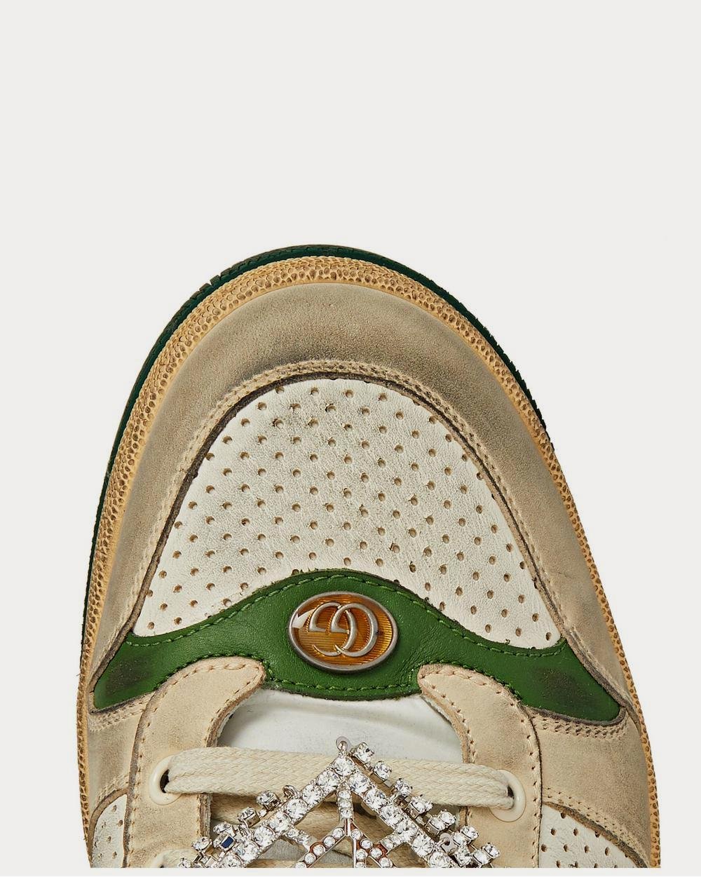 Baskets basses blanches Gucci Virtus en cuir vieilli orné de cristaux et de sangles